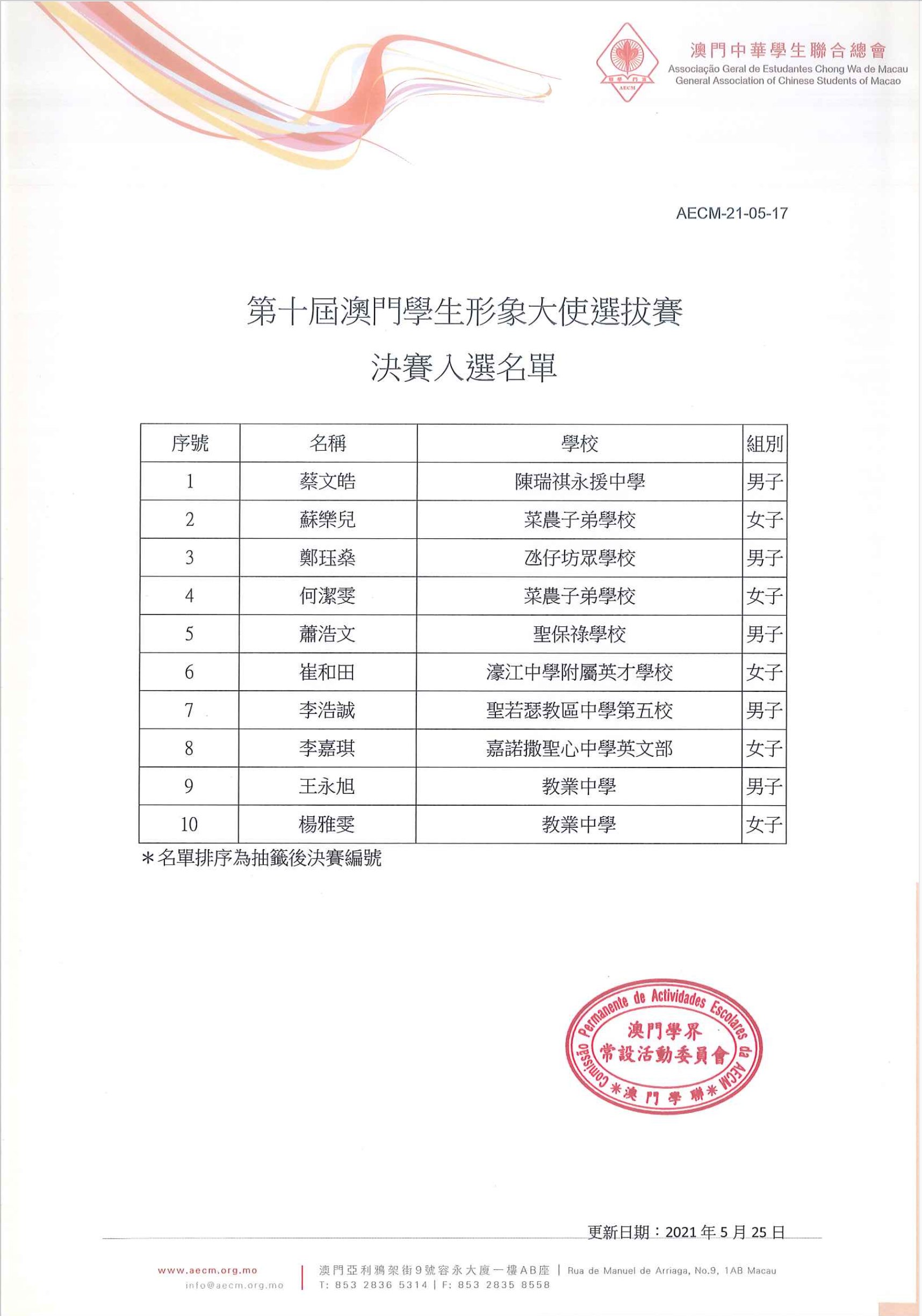 • 3第十屆澳門學生形象大使選拔賽十強選手出爐