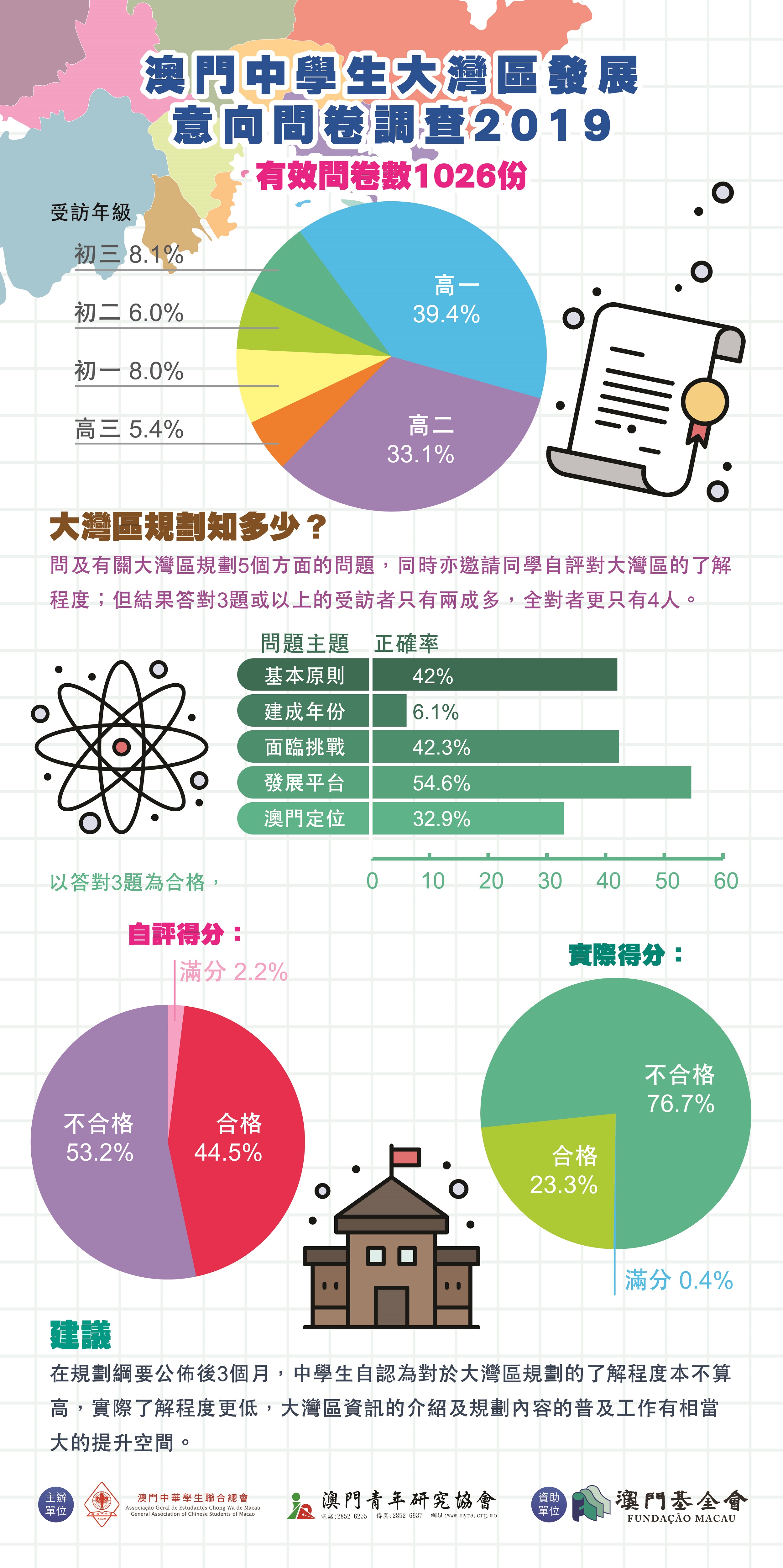 他們介紹,是次調查由學聯和澳門青年研究協會於五月開展,訪問了本澳十三家中學共一千○二十六名中學生,結果發現逾七成受訪中學生實際了解粵港澳大灣區規劃的程度為“不合格”,僅有二成多人“合格”。