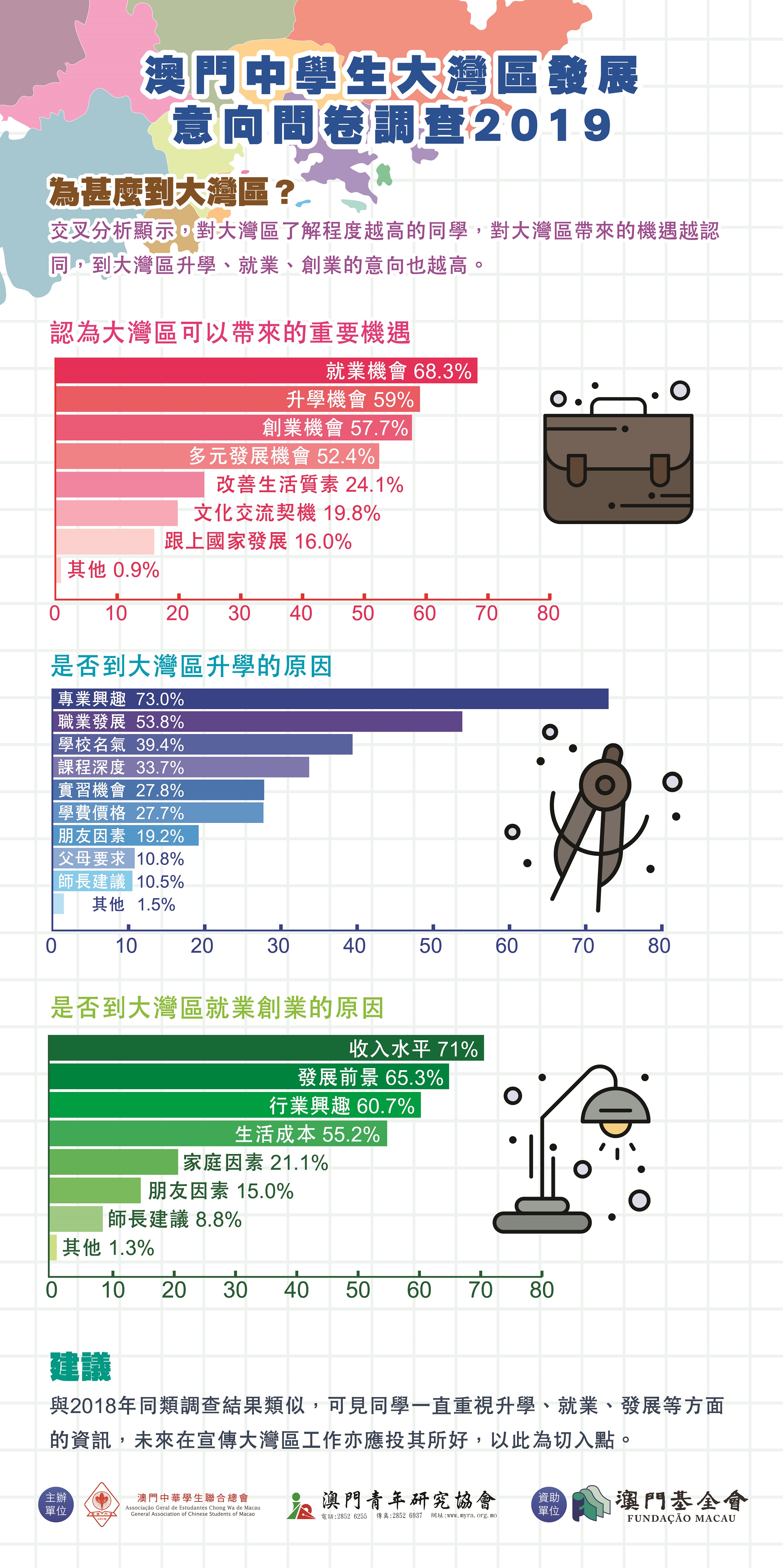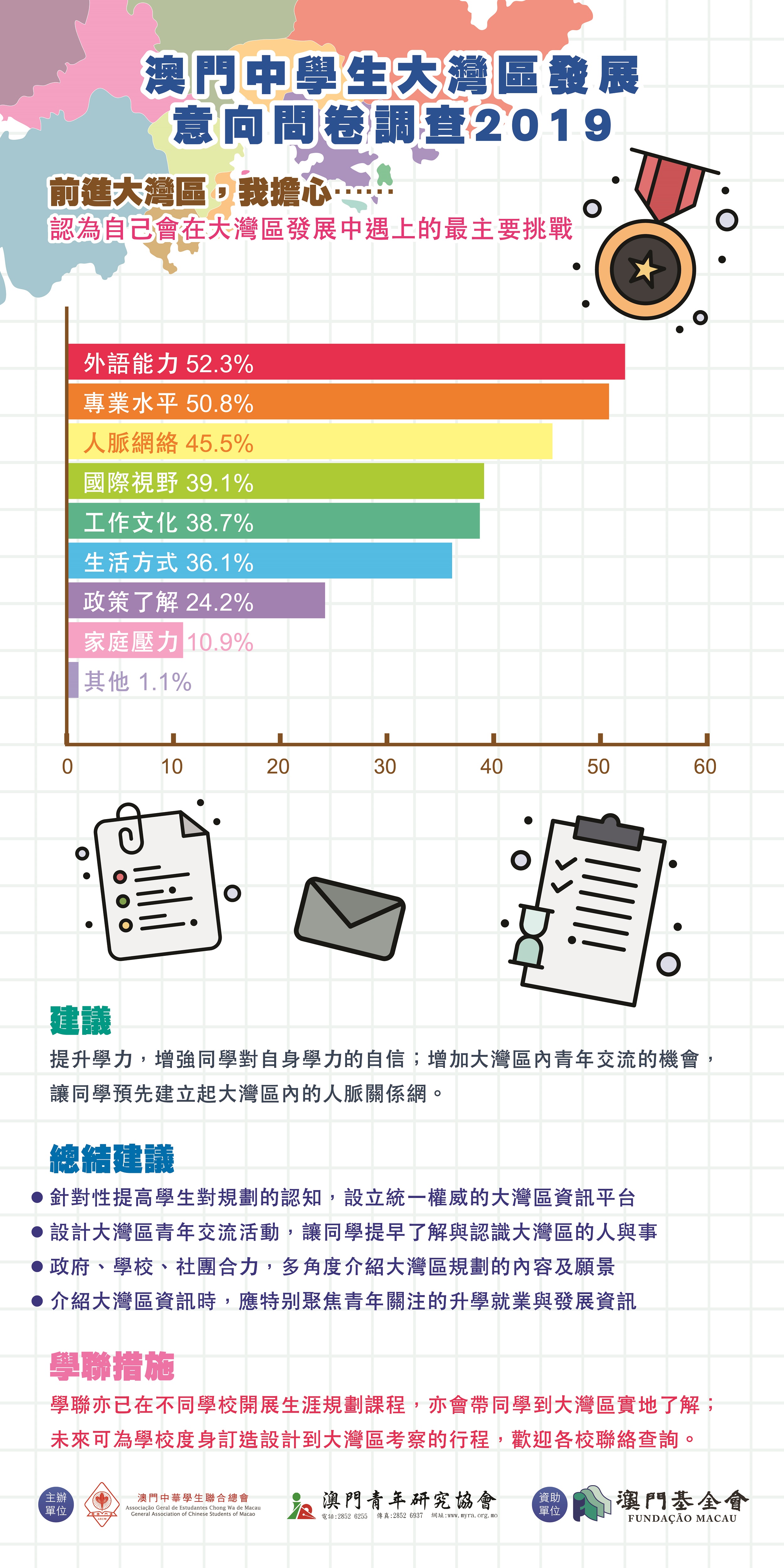 學聯調查本澳中學生對粵港澳大灣區發展的意向,結果發現逾六成八受訪中學生認為大灣區為將來帶來就業機遇,逾五成九人認為帶來升學機會,他們認為自身在大灣區發展中最主要需面對外語能力、專業水平、人脈網絡等挑戰,該會建議社會應加強宣傳推廣,建議政府應搭建機制如提供語言、專業技能培訓等,創設澳門青年到灣區發展條件。