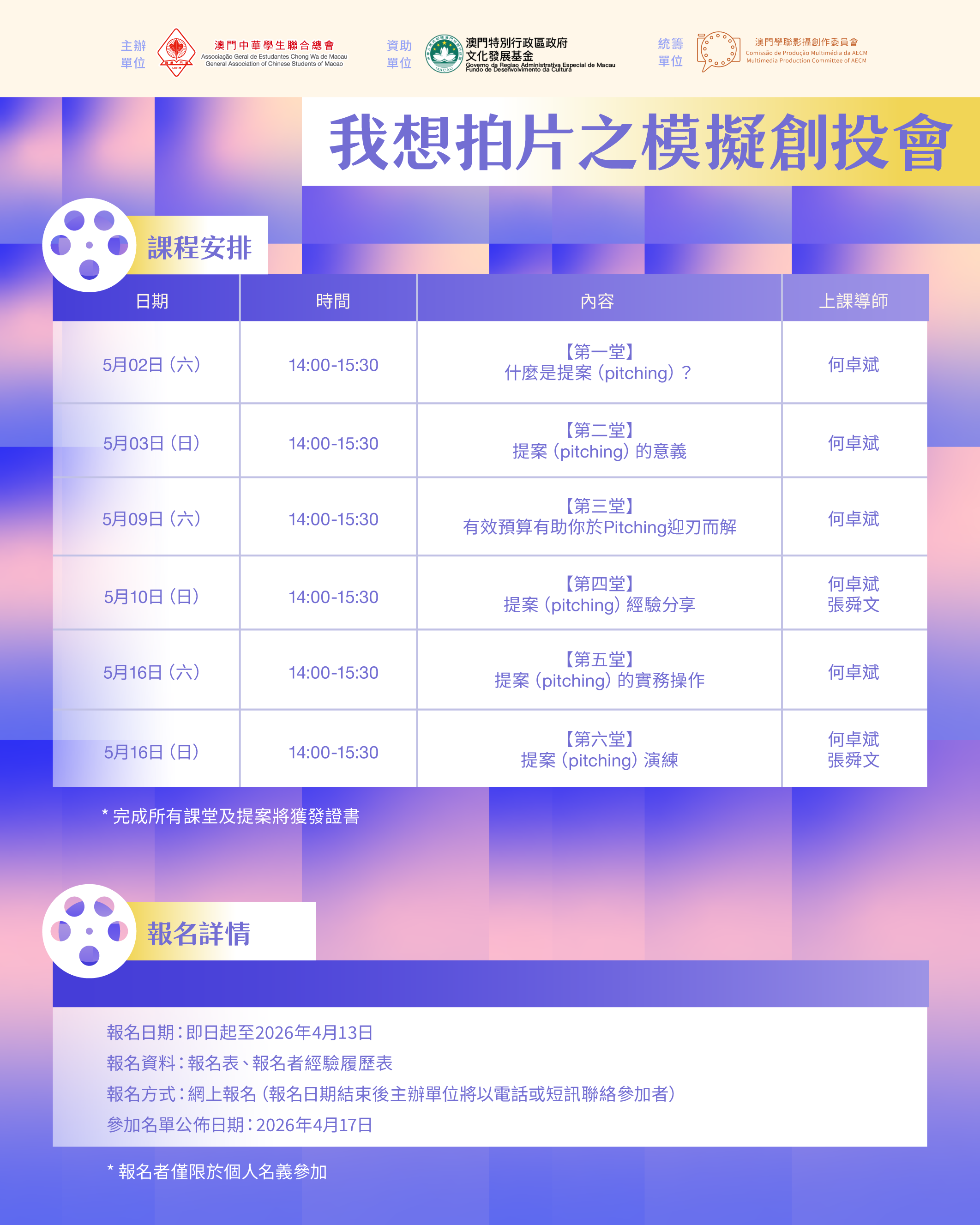日期 時間 內容 上課導師 5月2日(六) 14:00-15:30 【第一堂】什麼是提案(pitching)? 何卓斌 5月3日(日) 14:00-15:30 【第二堂】 提案(pitching)的意義 何卓斌 5月9日(六) 14:00-15:30 【第三堂】有效預算有助你於Pitching迎刃而解 何卓斌 5月10日(日) 14:00-15:30 【第四堂】提案(pitching)經驗分享 何卓斌 張舜文
