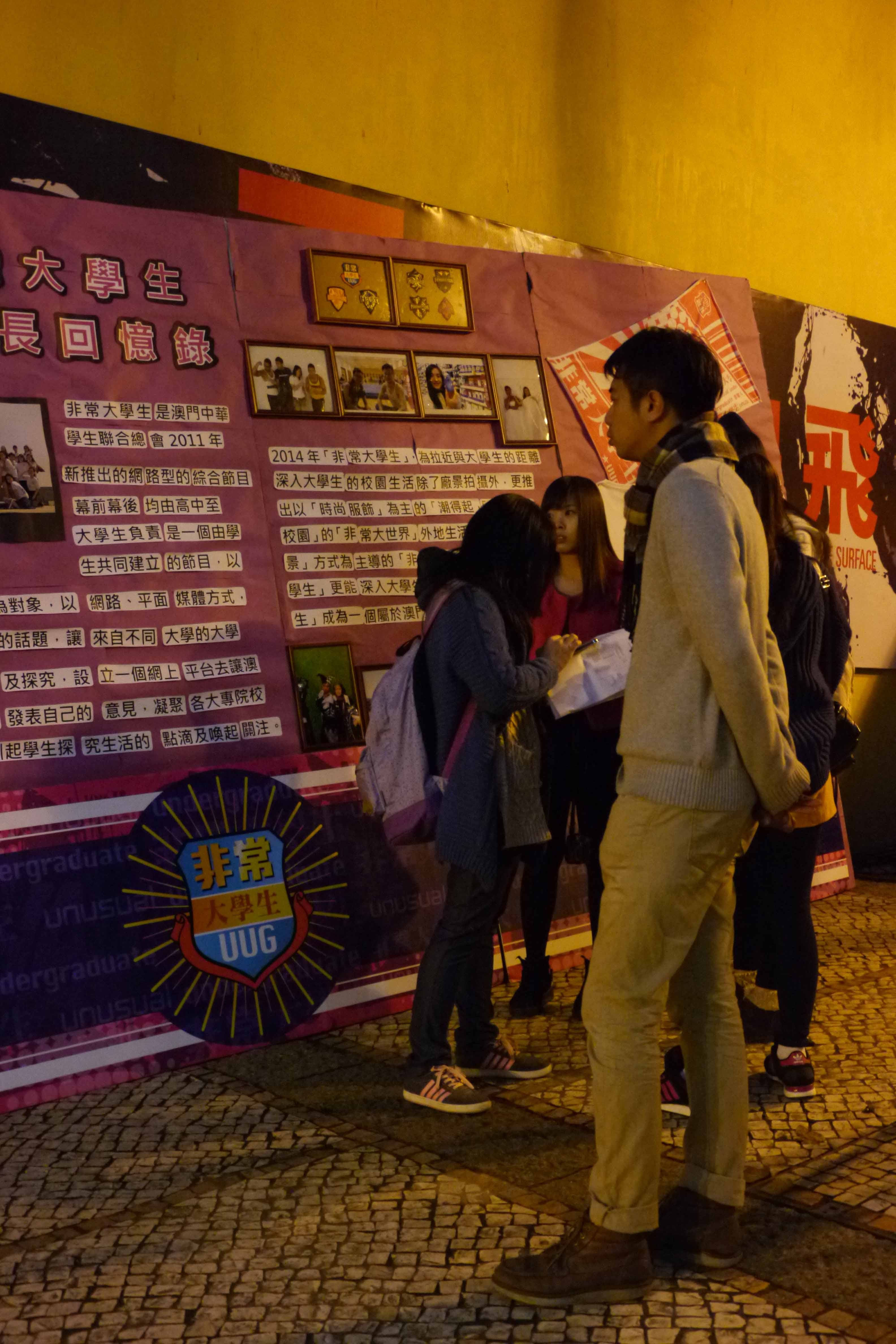 活動昨日下午五時至晚上九時在瘋堂十號創意園及瘋堂斜巷舉行,教青局代表張敏輝、學聯理事長梁子豪等出席。“非常大學生”是學聯於二○一一年推出的網絡綜合節目,對象為大學生。通過發掘大學生有興趣的話題,藉着網上平台讓學生發表意見,引起他們對生活的關注。