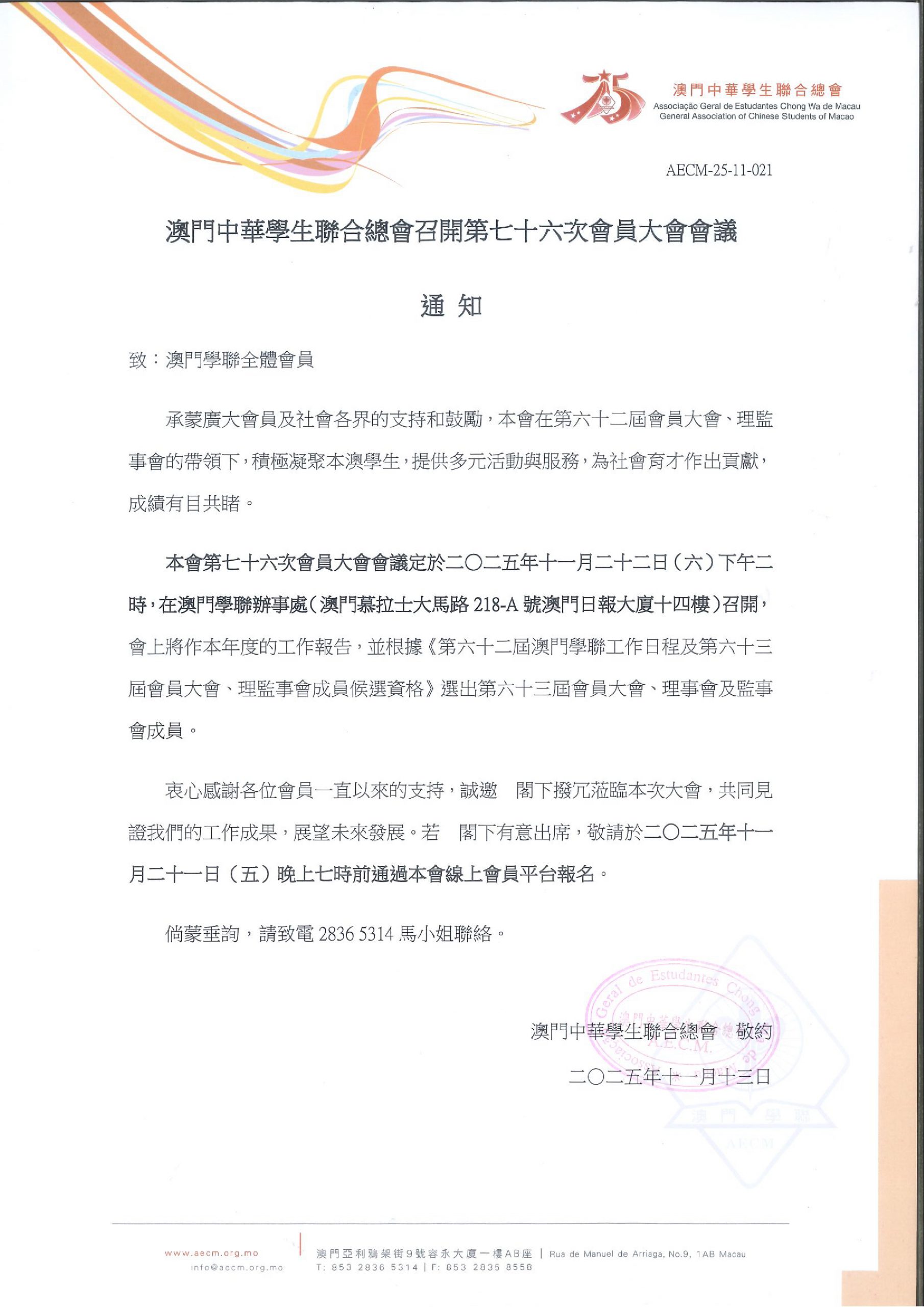 活動開始 11 / 13 活動完結 11 / 21 【通知】澳門學聯召開第七十六次會員大會會議 1【通知】澳門學聯召開第七十六次會員大會會議 ReadMore 【內地高校保送必讀2026強勢回歸🔥學生心得偷跑曝光】 2025-11-10 【通知】因追思節假期關係,本會將於2025年10月29日(三)不對外開放 2025-10-30 【通知】因重陽節假期關係,本會將於2025年10月29日(三)不對外開放 2025-10-24 Tweet 微信 Whatsapp 更多會員活動 2025年10月會訊 查看 【Only A.M.】萬聖節餅乾工作坊,一齊嚟整鬼馬曲奇啦! 查看 2025年9月會訊 查看 2025年8月會訊 查看 【會員福利】Only A.M 擴香石製作工作坊 查看 【2025會員優惠網】會員優惠推薦情報 查看 組織 學聯 分類活動 發佈2025-11-13 微信 Whatsapp 焦點活動 Hot 【抽獎結果】澳門學聯2025會員資料更新 Only A.M. 2025-07-09 【活動推介】2025澳門學聯最佳進步獎學金 2025-04-24 澳門學聯七十五載愛國之路專題特刊 2025-04-30 【形TV】〖問形啲〗EP72.全澳學校巡禮 鏡平學校篇 澳門中華學生聯合總會