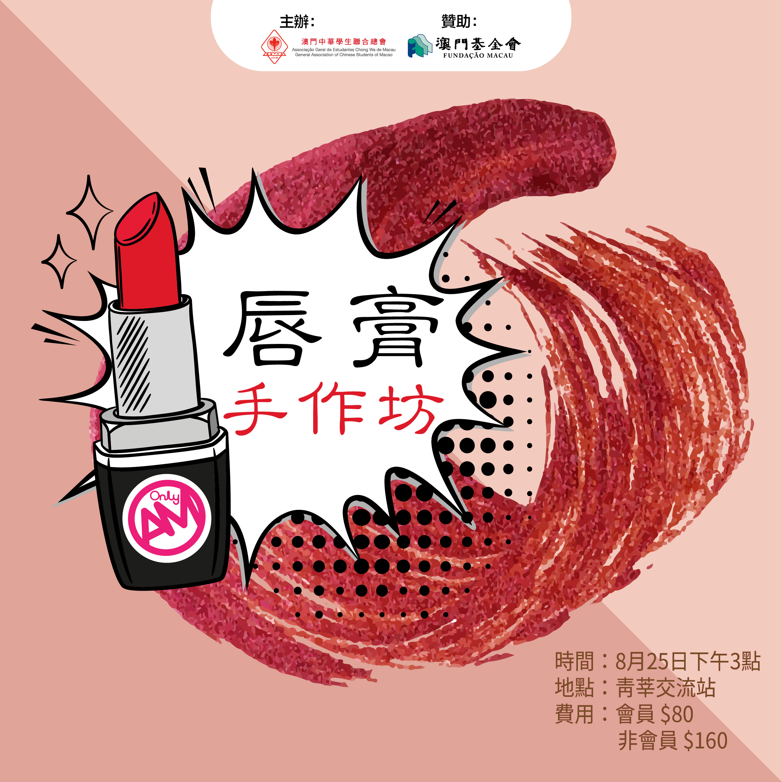 活動開始 07 / 26 活動完結 08 / 25 【2019年8月會員活動】唇膏手作坊 1【2019年8月會員活動】唇膏手作坊 小編推薦夏日唇膏手作坊 自制專屬的顏色,添加天然的成份 一枝唇膏就足以改變乾燥的雙唇 健康又天然的唇膏簡單GET啊~ **收穫 **4枝潤唇膏(有色) 活動資訊: 時間:即日起至滿額即止 費用:會員MOP80,非會員MOP160 地點:青莘交流站(澳門亞利鴉架街9號容永大廈2樓A,B) 報名方式:親身到青莘交流站繳交報名費 電話:2835 8657 ReadMore 【招募】2026年學界常設活動委員會(中學部) 2026-01-12 【活動推介】第二屆澳門青年國際禁毒大使培訓計劃 2026-01-09 【新聞稿】學聯紀錄片計劃落幕 2025-12-15 Tweet 微信 Whatsapp 更多會員活動 2025年12月會訊 查看 2025年11月會訊 查看 2025年10月會訊 查看 【Only A.M.】萬聖節餅乾工作坊,一齊嚟整鬼馬曲奇啦! 查看 2025年9月會訊 查看 2025年8月會訊 查看 組織 會員 分類活動 發佈2019-07-26 微信 Whatsapp 焦點活動 Hot 【抽獎結果】澳門學聯2025會員資料更新 Only A.M. 2025-07-09 【活動推介】2025澳門學聯最佳進步獎學金 2025-04-24 澳門學聯七十五載愛國之路特刊 2025-04-30 【形TV】〖校園狗仔隊〗EP64. 全運會空手道金牌得主:容君灝 澳門中華學生聯合總會