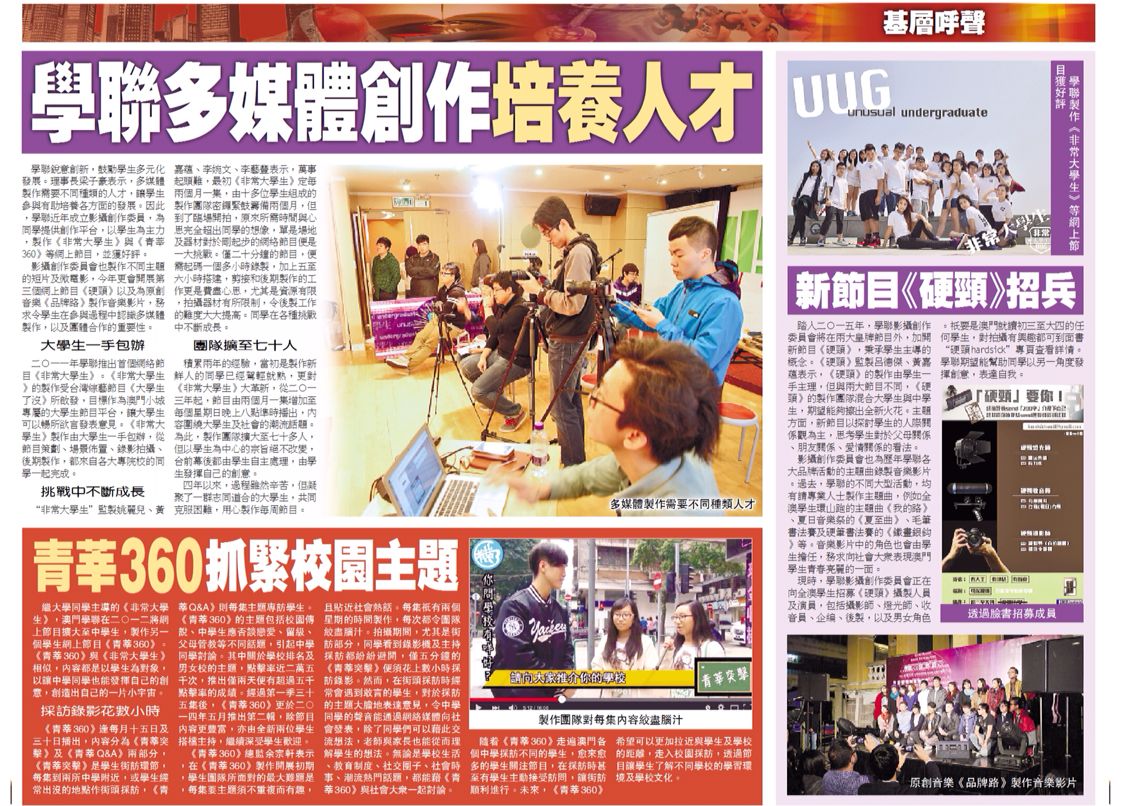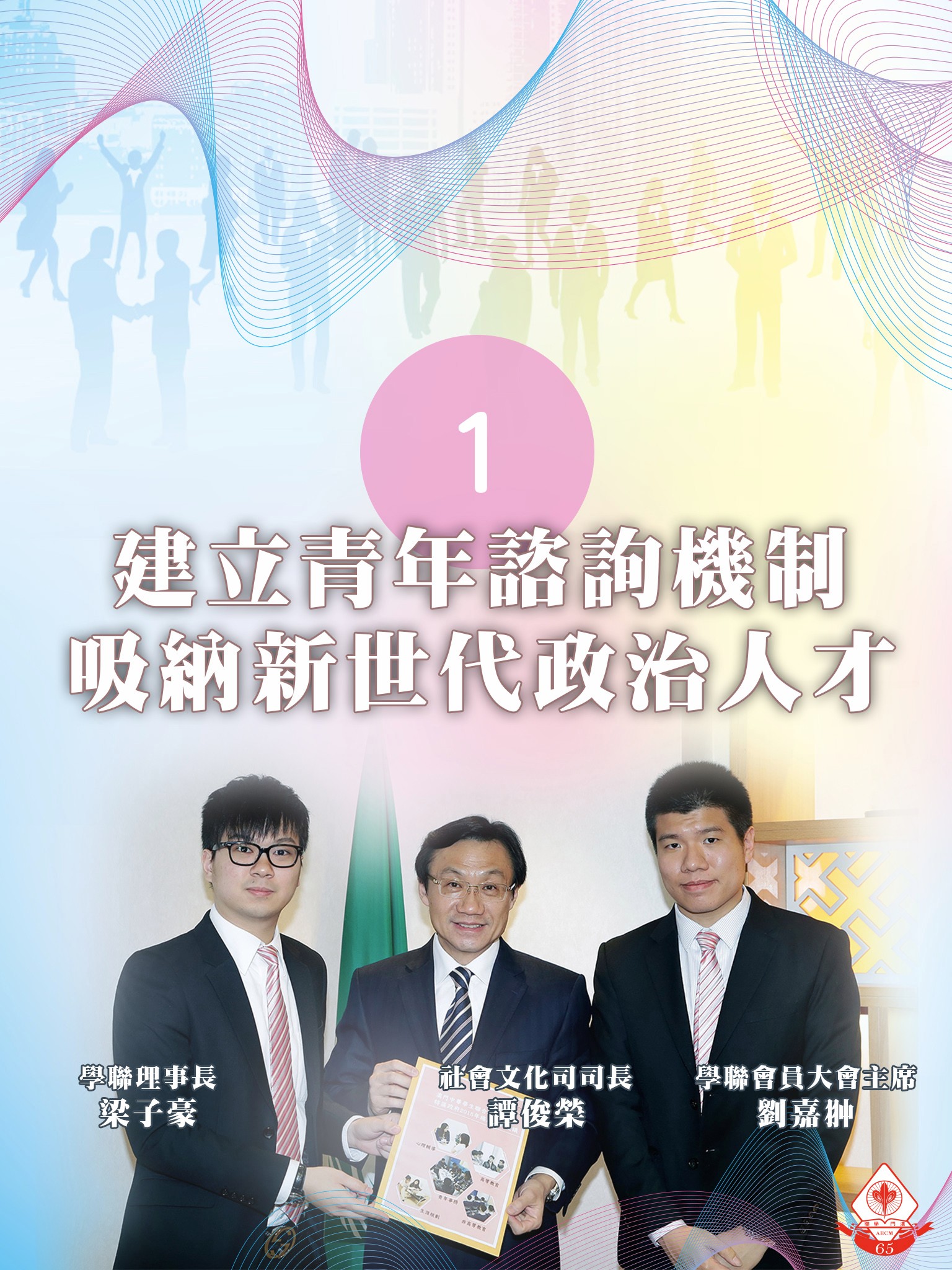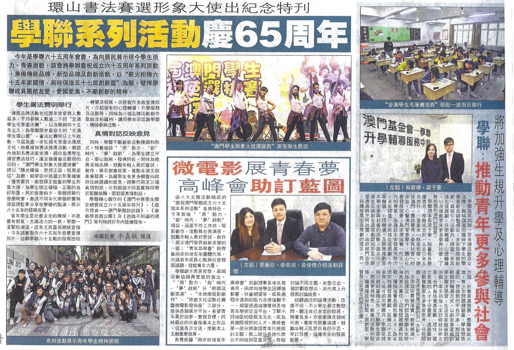 一周青年簡報(3月14日至3月28日) 50生力軍加入少年警訊 嘉賓與少訊學員合照 學聯主辦的“少年警訊二○一五”迎新營暨啟動禮昨日舉行,共有五十位新加入少訊成員宣誓服務社會。少年警訊活動委員會代總監黃俊傑表示,活動踏入第十八年,一直致力培訓本澳青少年的各項才能,提供更多發展平台,建立健康生活。有少訊學員認為,參與活動中學會在逆境完成任務,有助克服人生路上的各種困難。 活動昨日下午二時假教科文中心舉行,立法議員黃潔貞、教青局青年結社培訓暨輔導處長陳旭偉、民署代表鄭繼明、司法警察局代表朱惠敏、檢察院代表鄺彼得、保安高校代表陳堅良、社工局代表黎國華及多所學校、社團負責人出席,並向獲少訊菁翀獎、最優秀學員、最優秀領袖的多名學員頒獎。 黃俊傑表示,近年本澳經濟全面發展,但社會不同形式的罪案不斷上升,吸毒、藥駕、青少年犯罪等屢見不鮮,政府、學校、家庭以及社會各界應緊密合作,共同為青少年成長建立安全穩定環境。因此,學聯希望續與社會各界合作,透過一系列不同類型的培訓訓導,助青少年建立正確的人生觀和價值觀。少訊舉辦多年,不少昔日的學員已投身社會,為廣大居民服務。希望新學員繼續發揚少訊“團結、服從、信任”的精神,將學到的知識學以致用,回饋社會。 在嘉賓見證下,新一屆學員宣誓參與少年警訊。他們將參加急救班、步操、參觀紀律部隊和探訪等多項活動。去年開始參加少訊、獲頒最優秀學員的黃倩瑩認為,活動中學會在逆境完成任務,有助克服人生路上不同的困難。 刊登於2015年3月15日澳門日報 B5 社文範疇施政學聯提七建議 澳門中華學生聯合總會作為青年學生社團,一直關心青年學生身心健康發展。近期特區政府將公佈施政報告,為此學聯早期曾作內部討論,收集會內意見,以向特區政府社會文化範疇施政提出七點建議,期望意見有效幫助政府制訂政策,助特區青年未來發展。 建立青年諮詢機制 鑑於現時不少本澳青年反映政府在制訂政策時未能聽取他們的意見,建議建立有效青年諮詢機制,充分聽取青年聲音。類似的互動形式過往已經制訂並曾經舉辦過相關活動,如高教辦的大專生部落與官員網上互動,可惜未能持續執行。 期望各主要官員起帶頭作用,定期舉行與青年對話的意見收集和交流活動,讓官員持開放態度,聽取不同意見,及時向青年介紹或解釋現行工作,建立與青年直接溝通交流的渠道。 行政長官崔世安曾表示認同需要培養政治人才,讓有志服務特區政府和廣大市民的年青人向上流動,學聯希望澳門政府仿效香港政府做法設立政治助理職位,公開在社會招攬青年人才參與政治。政府可嘗試在現行的公務人員職程中增設一個特別職程,職能為協助部門主管人員作出決策,知識考核更偏重政治理論和政策制訂等創新能力,期望為政府的決策注入民間智慧和創新思維,延續澳人治澳和人才治澳的生命力。 房策調整為民制產 現時年輕人的學歷及工資水平均較以往高,他們工作數年應已有一筆積蓄,始終無力負擔高樓價。已達適婚年齡的青年,若仍與父母同住感不便,但既無法申請社屋,無法負擔私樓,自然令青年人將置業期望寄托於申請經屋,但超額認購和抽籤方式均不利青年人輕易上樓。 據香港經驗,公屋政策可用於“為民制產”,即由政府協助市民改善生活。政府一可利用社屋協助貧戶脫貧,因社屋戶可免於承受市場的高昂租金、減低生活成本,再謀發展;二可鼓勵社屋富戶購買經屋,在政府協助下可以較低的價格擁有自己物業,最終能夠自置物業,完成社會階層的晉升。 學聯亦建議政府可思考興建青年公共房屋,以較社屋高的租金出租予青年人,並可在青年人有能力置業或成功獲分配經屋時發回部分租金,作為支援政策,紓緩青年的生活壓力。 生涯規劃思考前程 鄰近地區均鼓勵學生於中學時期開始生涯規劃,台灣更是將生涯規劃納入“普通高級中學課程綱要”中的選修科目,提供課程綱要,各校自行編製符合自身需要的教材。讓生涯規劃融入正規教育課程,讓學生在學習知識之餘,並能思考學習在其人生中的重要性,成為社會未來的人才。同時,推動家長了解生涯規劃,讓家長擺脫傳統思想對子女生涯規劃的影響,為青年學生提供理想的規劃環境。 現時澳門有社團已開展生涯規劃及升學輔導,具有一定專業性、經驗及資訊,建議政府可與社團合作開展上述工作,相信能更有效率的發展生涯規劃的各項工作。澳門於一九九七年亦有出版過職業分類大典,但後來並沒有更新,回歸後社會急速發展,行業環境日新月異,希望政府能盡快並定期更新澳門職業大典,幫助青年了解本地就業市場,有助於青年人生涯規劃。 強化學生抗逆能力 政府可加強學校在學生對抗壓力時的支持作用,開展抗逆力課程,指導學生處理壓力的正確方法,以及提升學生輔導員及老師對學生高壓狀況的察覺能力,並推動學校多開展不同形式的壓力或外展體驗活動。建議以心理健康為題制定課程大網,其中可包括面對壓力、情緒紓緩、生涯規劃等,藉此亦可提升學生品德及抗壓力,幫助學生建立正面形象。 由於課餘時間有限,再加上學生的課餘活動衆多,現有的校內輔導員難以安排時間與學生輔導,建議增撥資源於民間機構開設相關服務,滿足學生校外輔導需求。一直以來,澳門社工及心理輔導員分工不清,缺乏規
