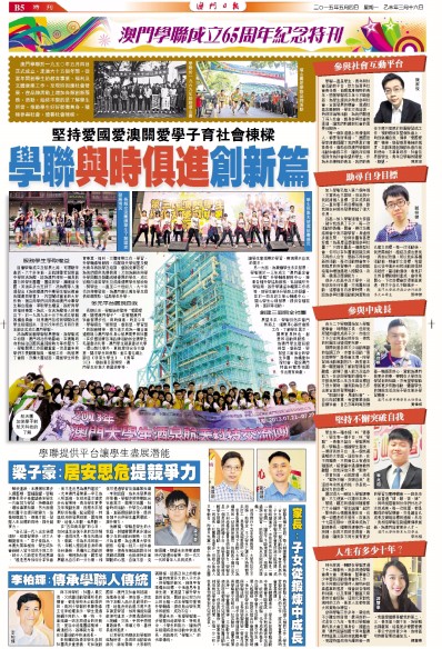 澳門學聯於一九五○年五月四日正式成立,走過六十五個年頭。從當年開創學生的教育事業、福利及文體康樂工作,至現時因應社會發展,在品牌活動上增加各類創新服務、活動,始終不變的是了解學生所需,推動學生好好裝備自身,積極參與社會,培養社會棟樑。