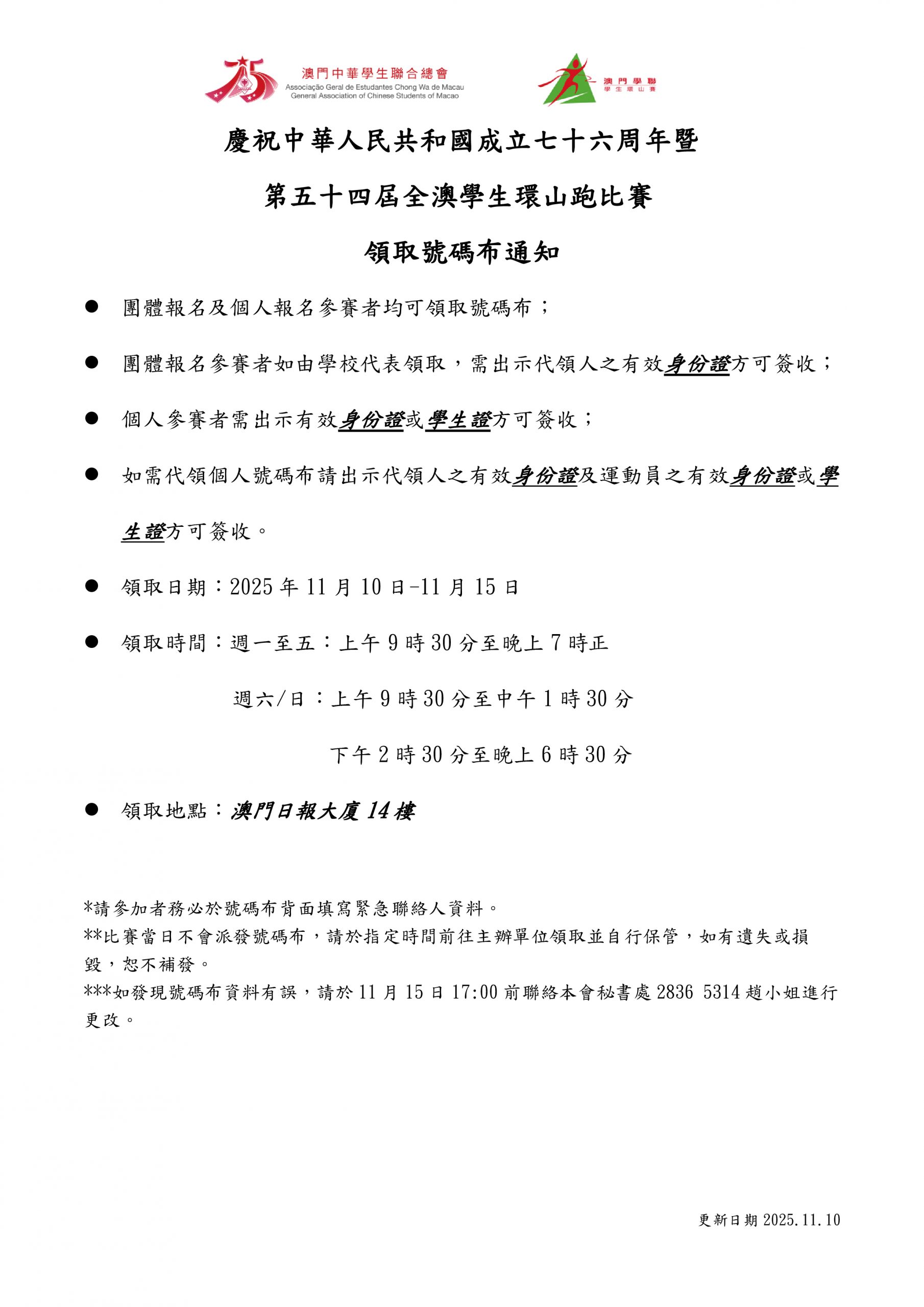 關於第五十四屆全澳學生環山跑比賽的更多資訊,敬請留意澳門學聯官網、微信公眾號及Instragram,或追蹤@run.aecm,了解環山跑比賽後續通知。