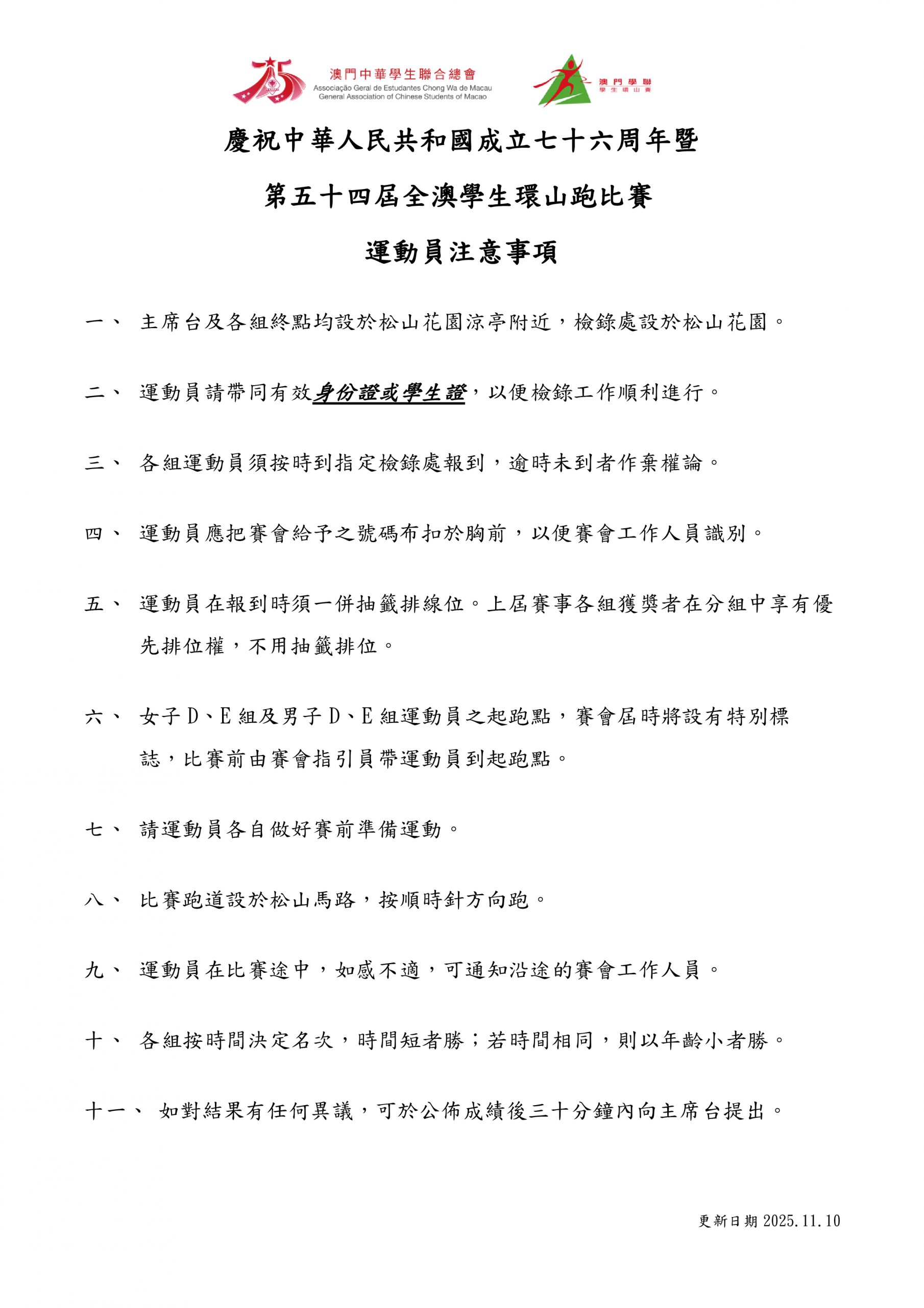 • 3【賽程表】慶祝中華人民共和國成立七十六周年暨第五十四屆全澳學生環山跑比賽