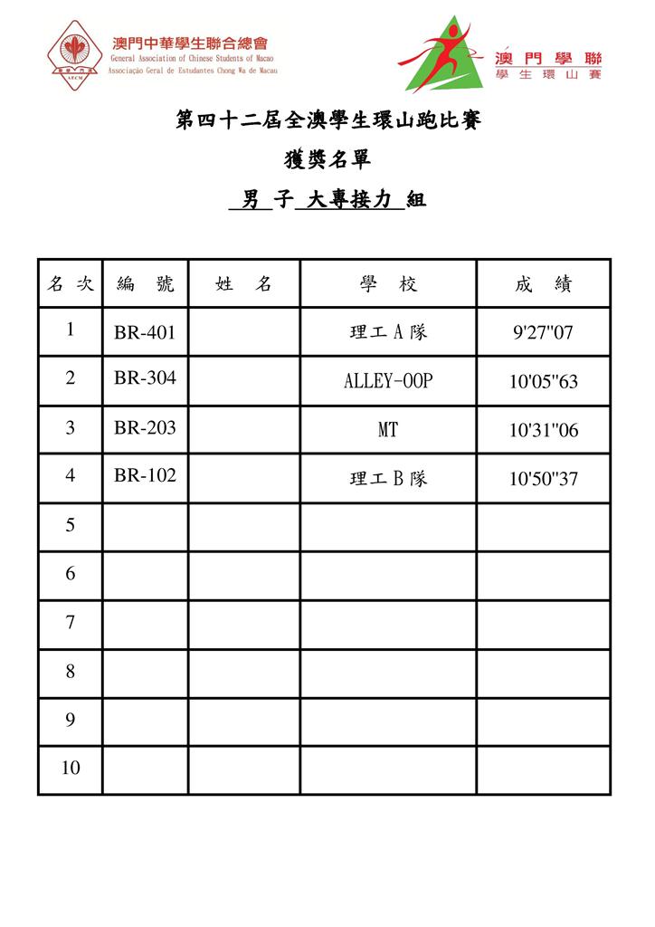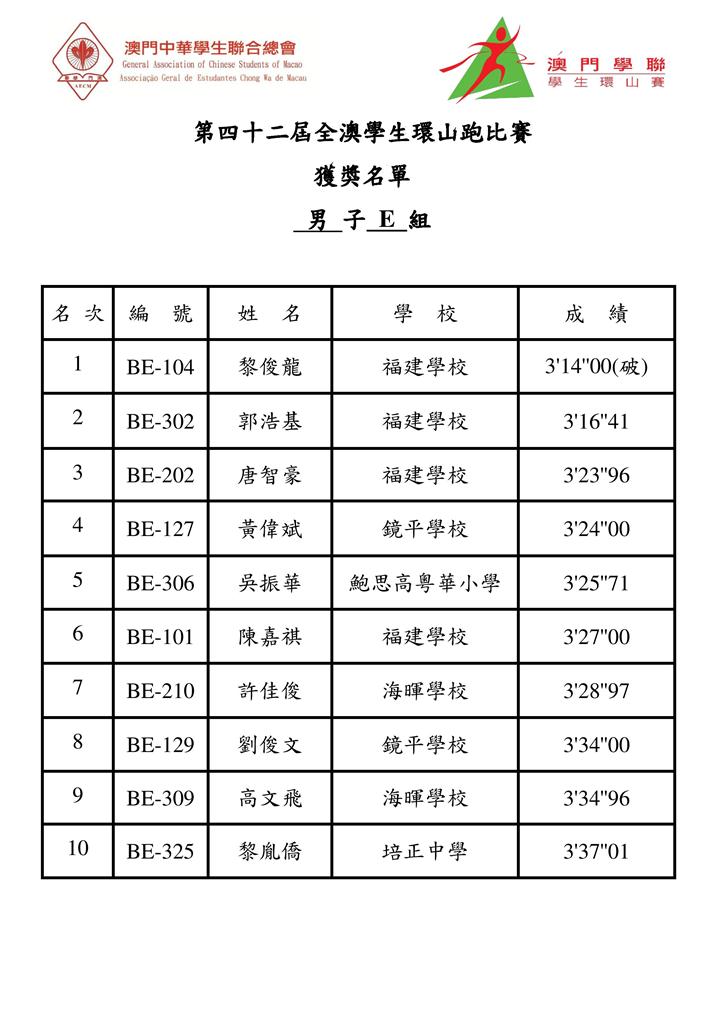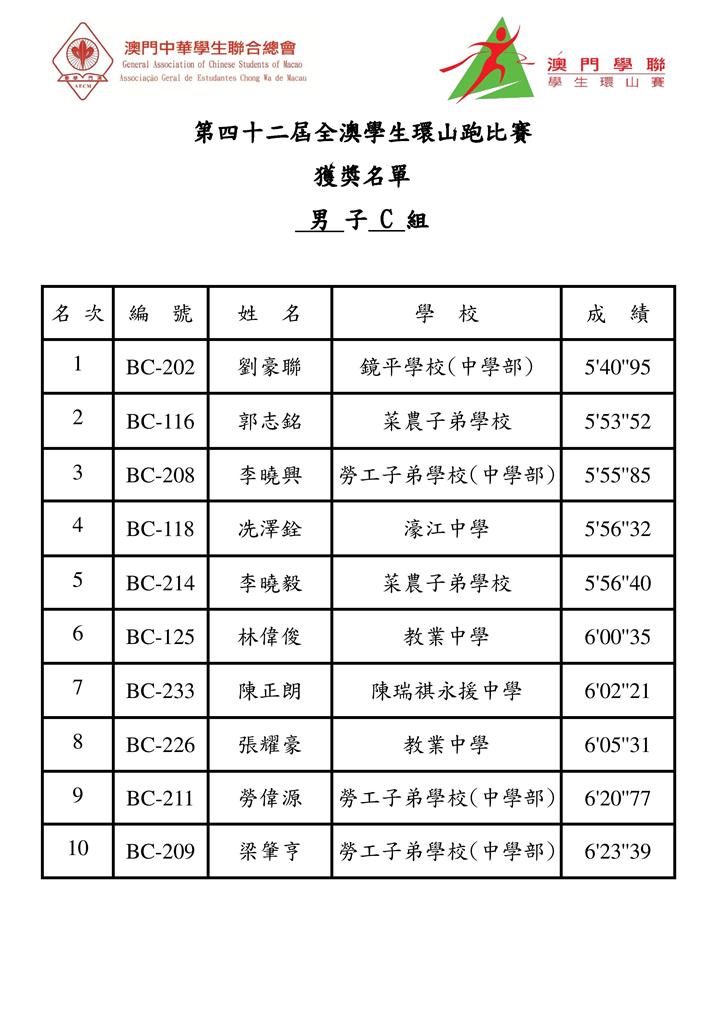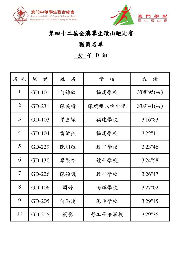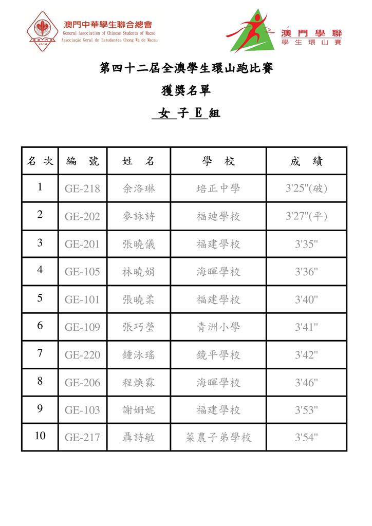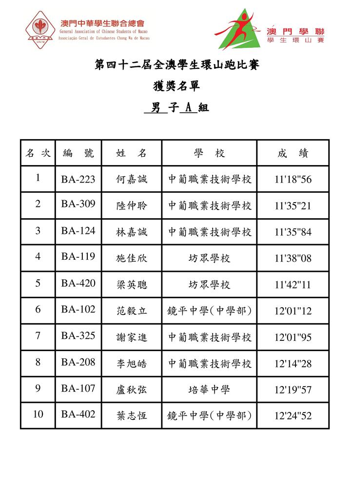 今 屆全澳學生環山跑比賽各組別獲冠名單包括:大專組,王坤(理工)、吳楊楊(理工);A組,何嘉誠(中葡職中)、李楚盈(濠江中學),B組,何權輝(澳門坊 衆學校)、蕭嘉美(化地瑪聖母女子學校);C組,劉豪聯(鏡平中學)、黃婷鈺(福建學校);D組,江志樂(鮑思高粵華小學)、何錦欣(福建學校);E組, 黎俊龍(福建學校)、余珞琳(培正中學)。