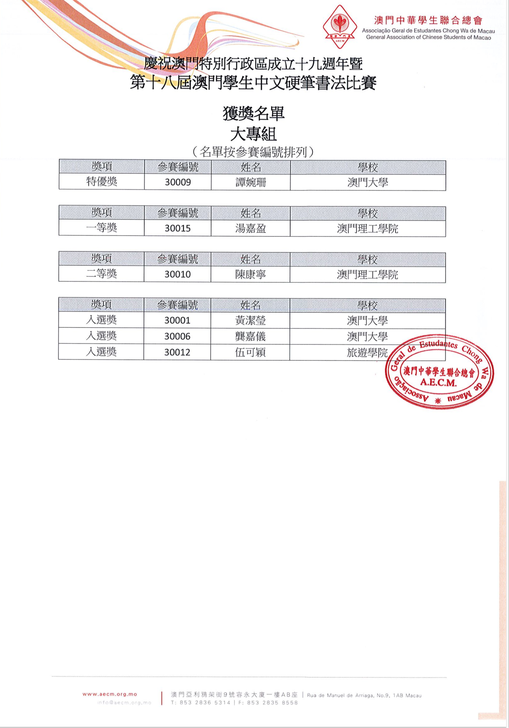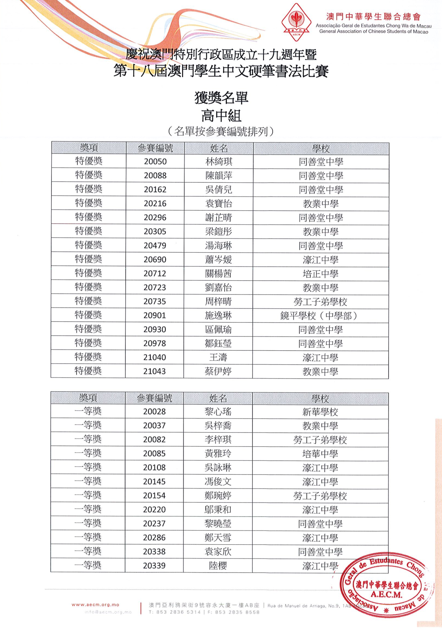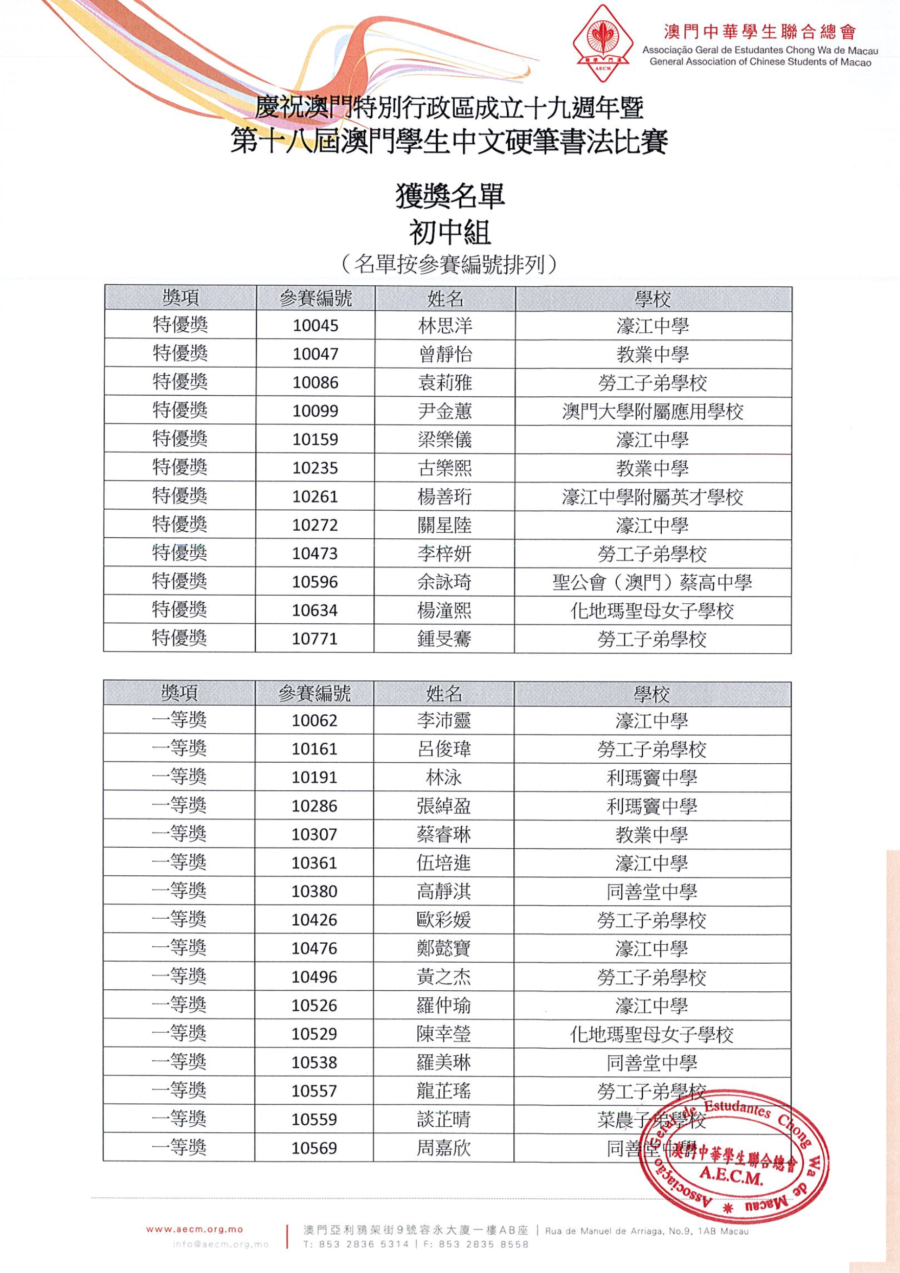 【得獎名單】慶祝澳門特別行政區成立十九週年暨第十八屆澳門學生中文硬筆書法比賽
