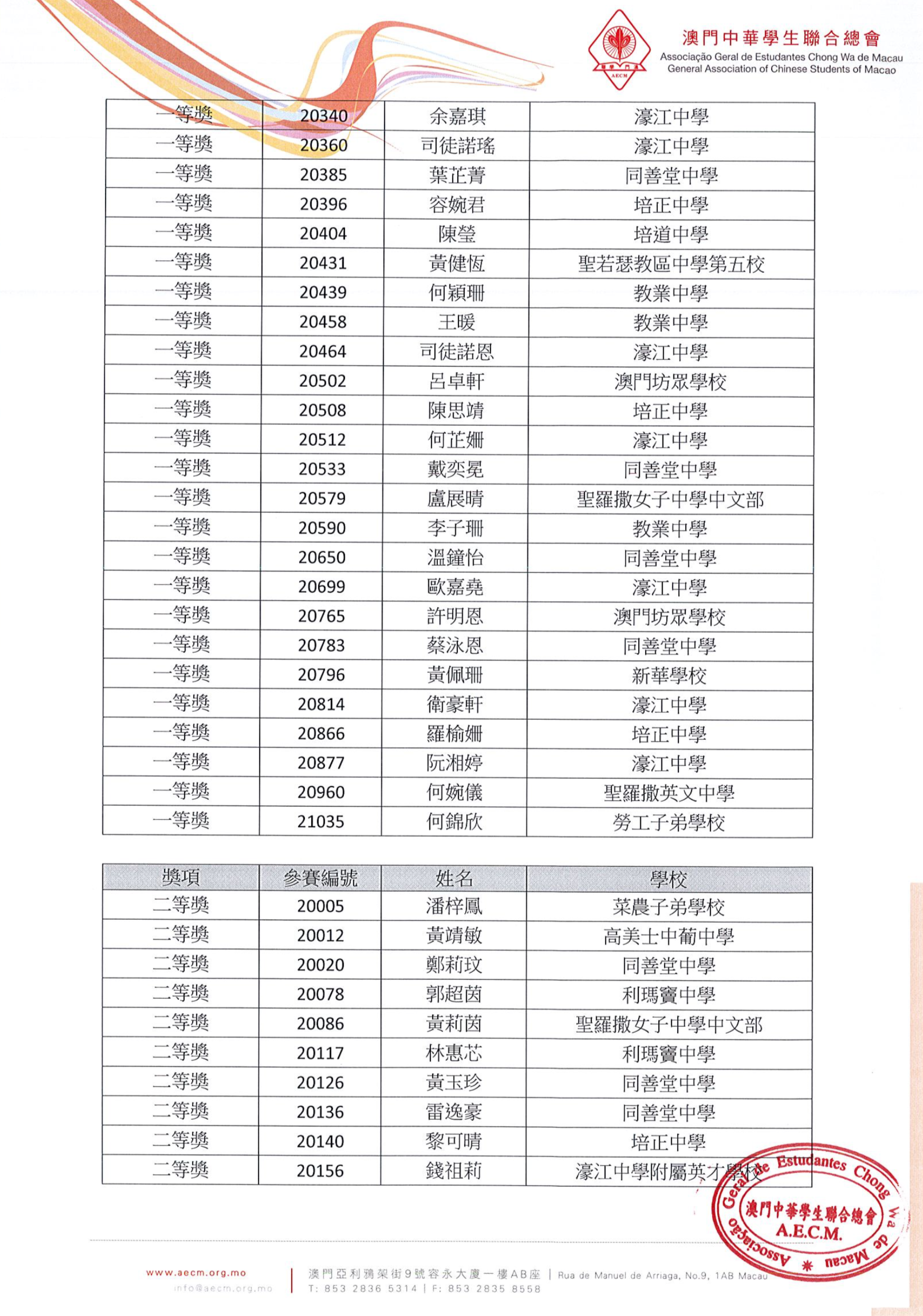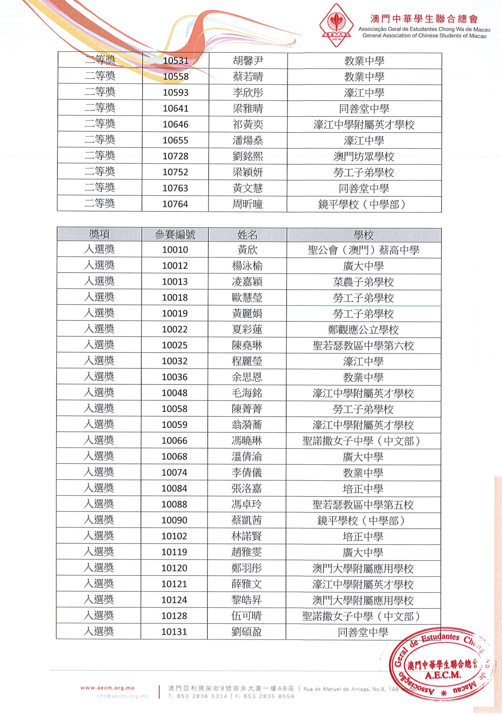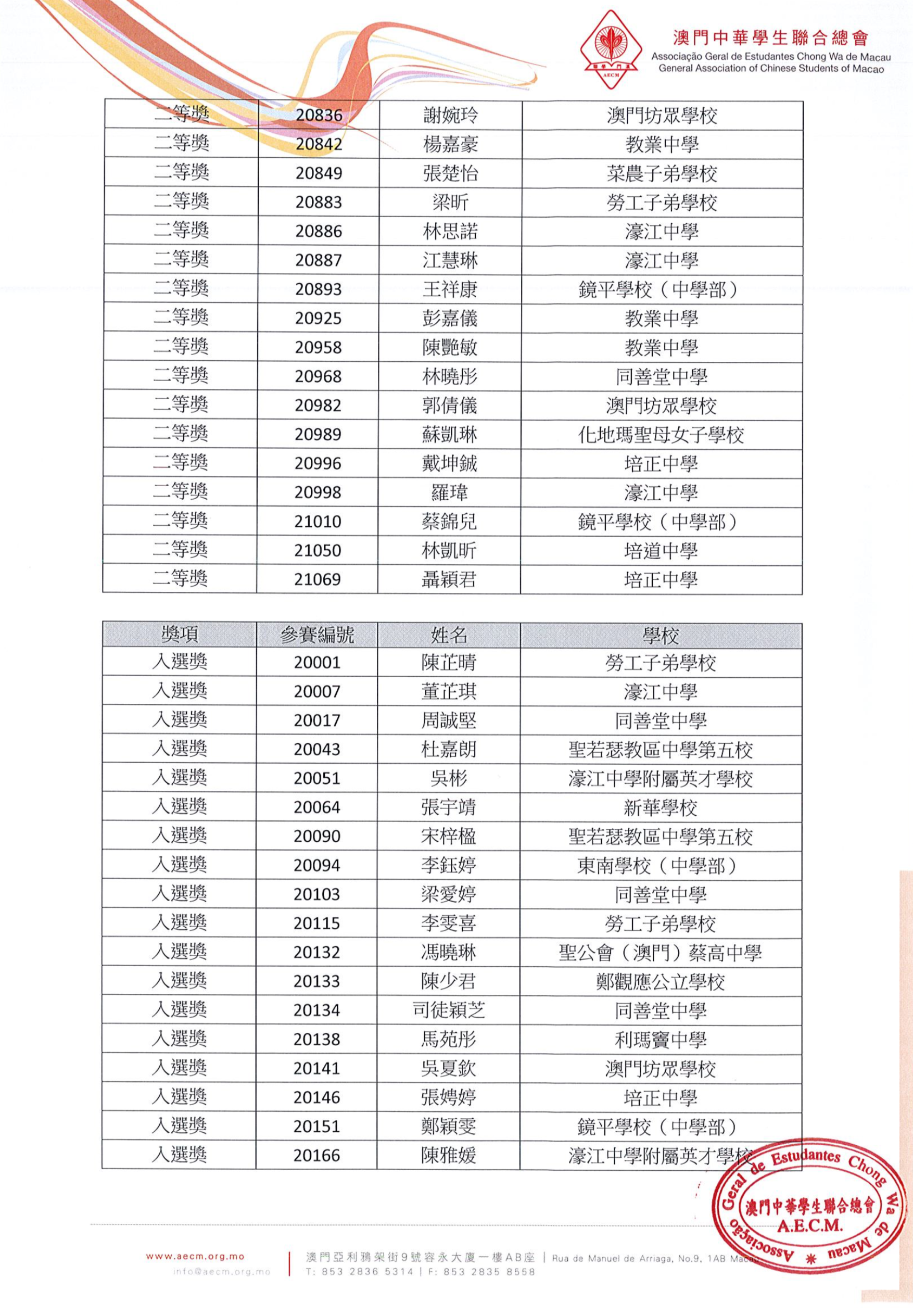 【得獎名單】慶祝澳門特別行政區成立十九週年暨第十八屆澳門學生中文硬筆書法比賽
