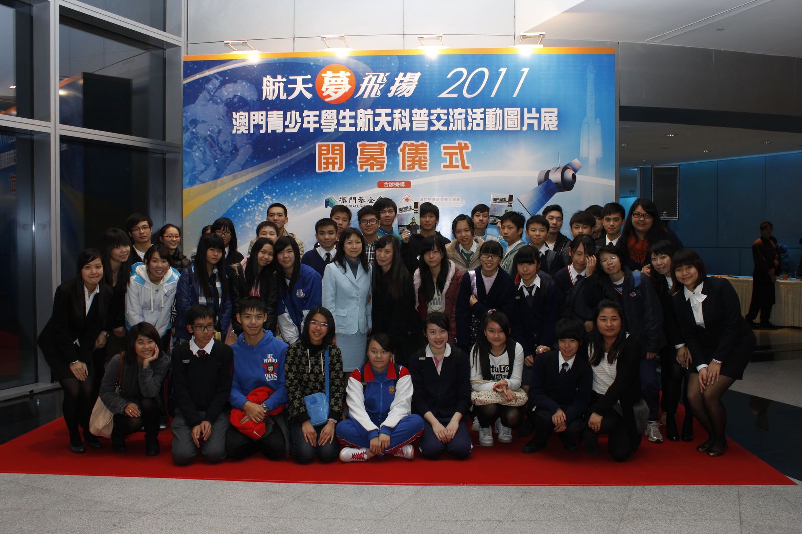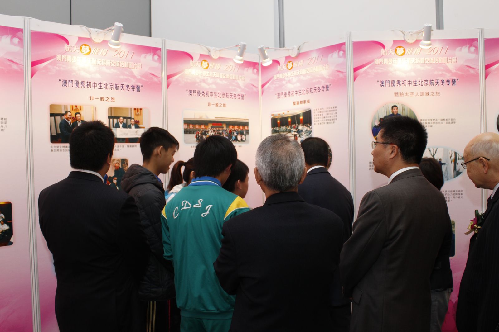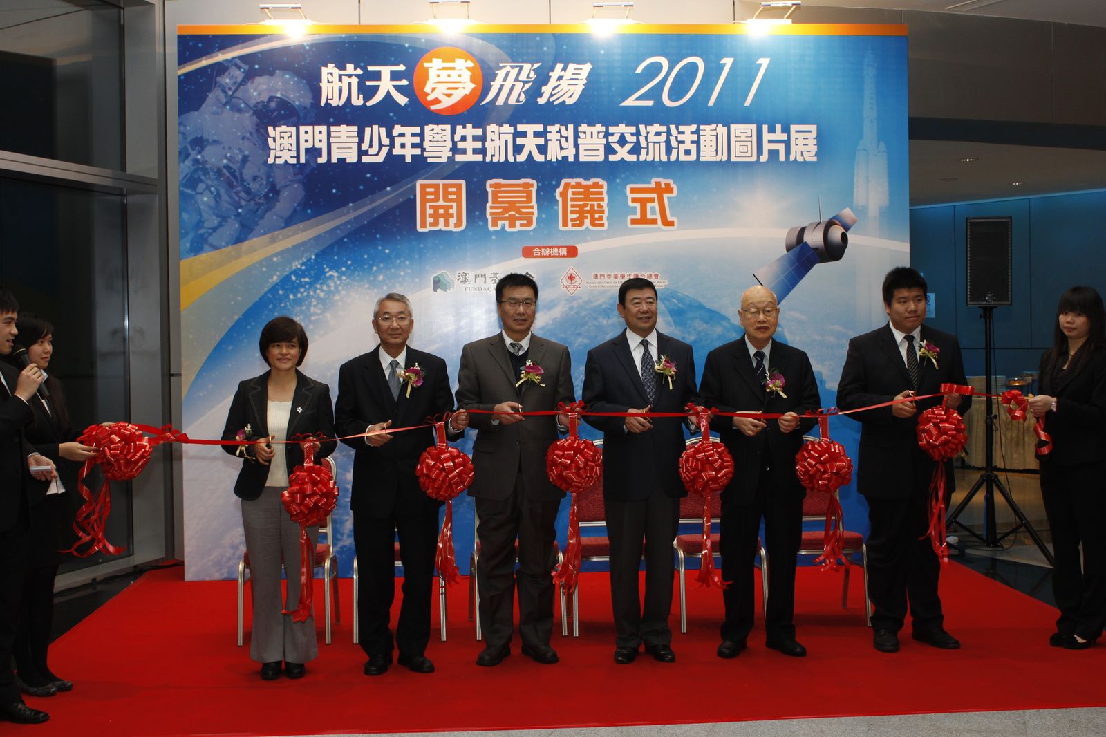 二○一一澳門青少年學生航天科普交流活動包括“中學生西昌航天科普夏令營”、“大學生酒泉航天科技交流團”以及“優秀學生北京航天冬令營”,相關圖片展昨日下午六時半假科學館大堂展覽廳開幕,中聯辦人事部部長常毓興、澳門中華聯誼會會長廖澤雲、澳門基金會行政委員會副主席林金城、澳門日報社長李鵬翥、教青局青年廳長袁凱清,以及學聯理事長劉嘉翀主持剪綵禮。