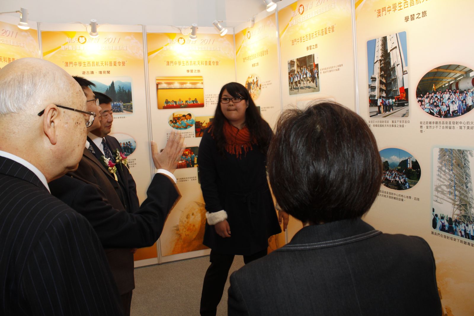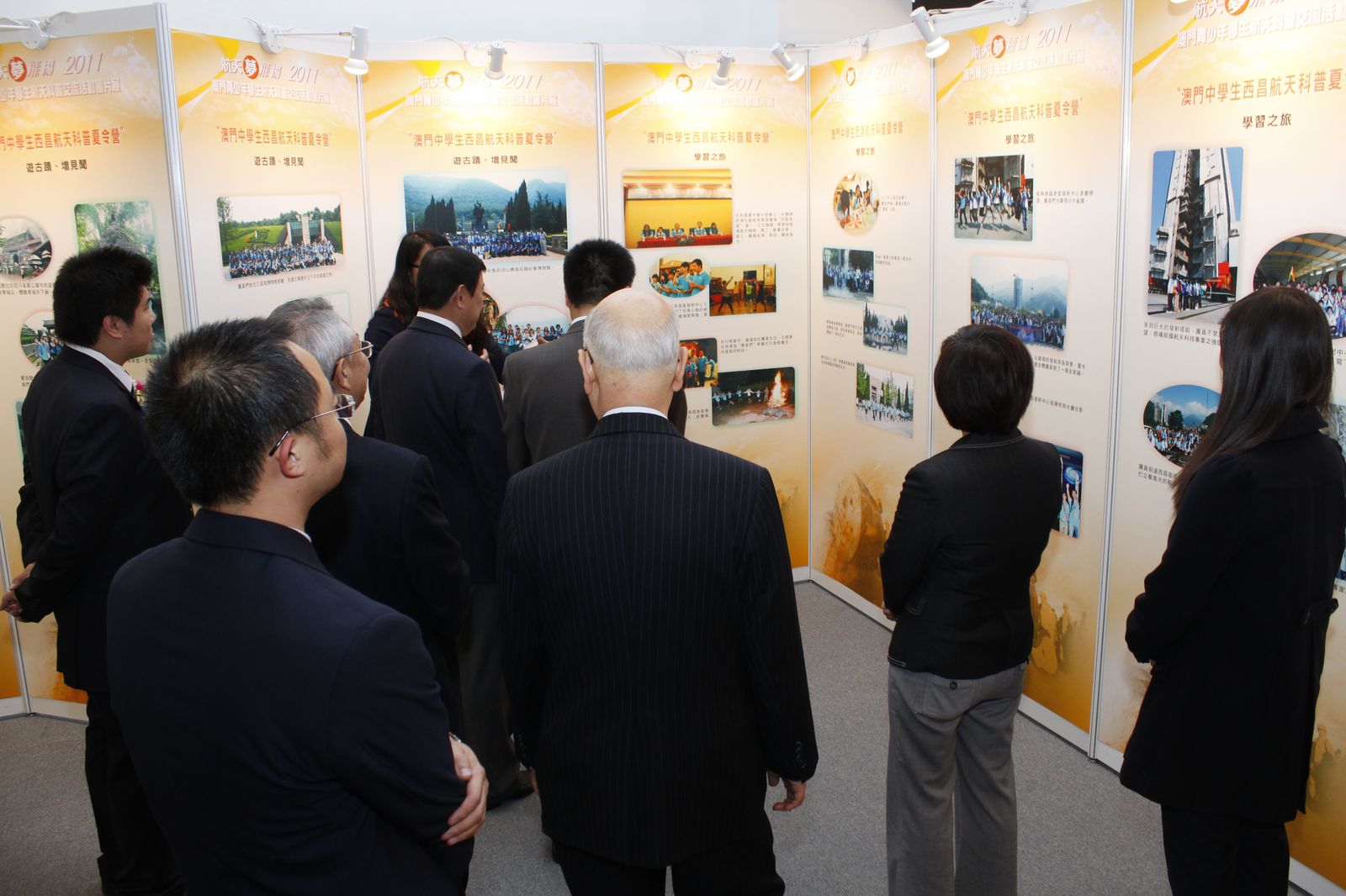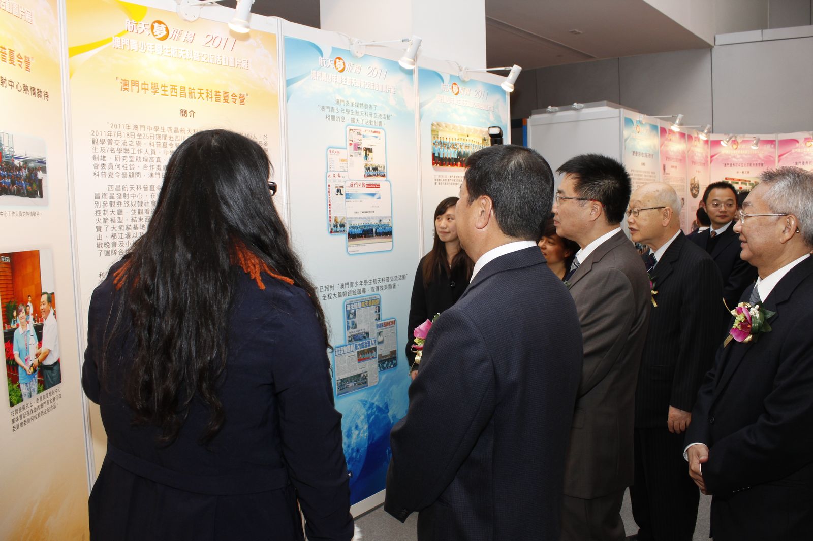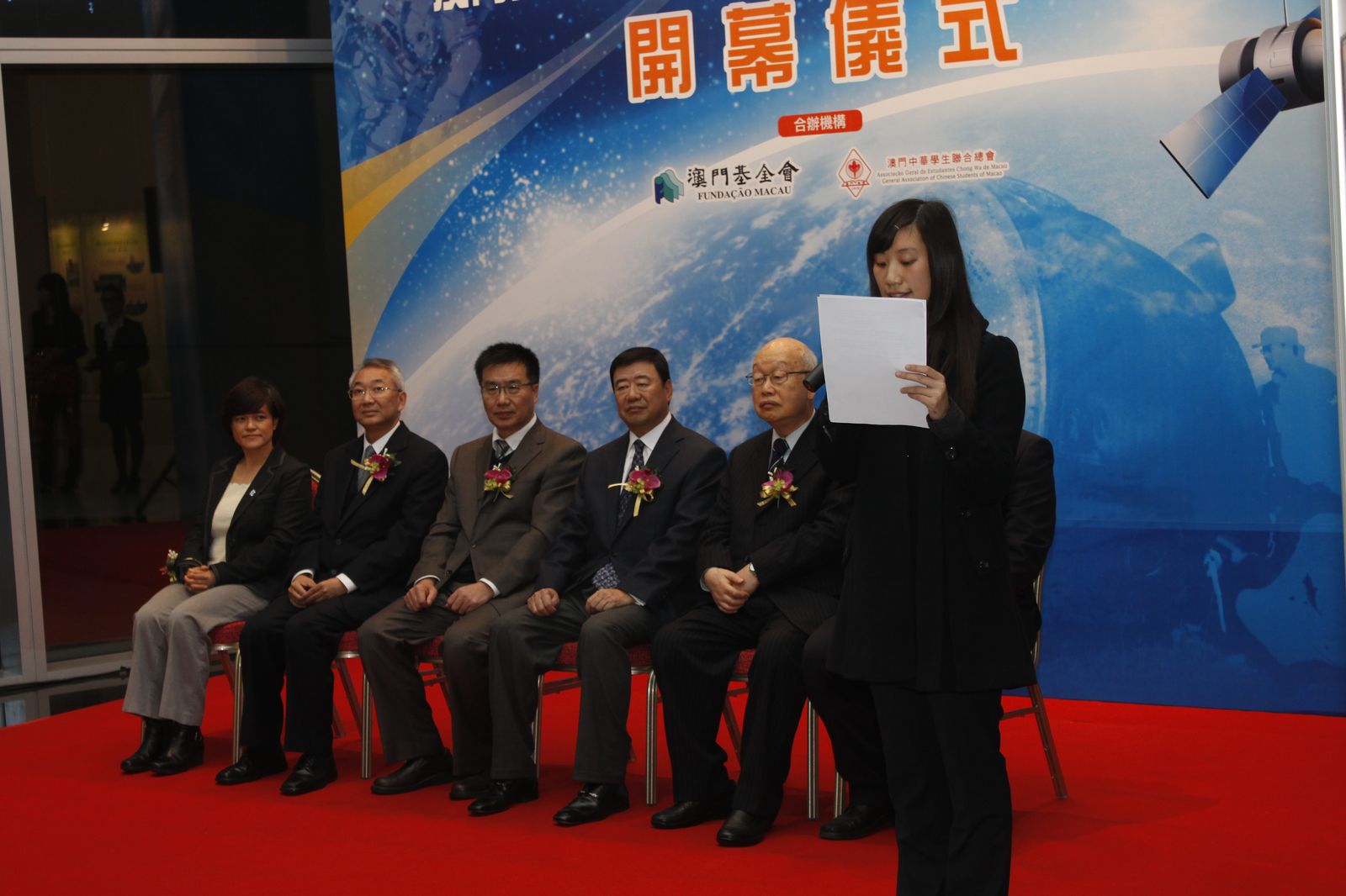 二○一一澳門青少年學生航天科普交流活動包括“中學生西昌航天科普夏令營”、“大學生酒泉航天科技交流團”以及“優秀學生北京航天冬令營”,相關圖片展昨日下午六時半假科學館大堂展覽廳開幕,中聯辦人事部部長常毓興、澳門中華聯誼會會長廖澤雲、澳門基金會行政委員會副主席林金城、澳門日報社長李鵬翥、教青局青年廳長袁凱清,以及學聯理事長劉嘉翀主持剪綵禮。