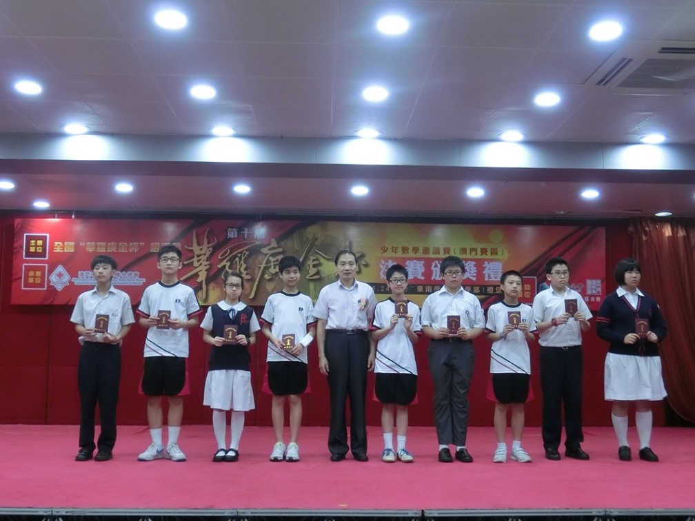 【本報消息】由澳門基金會及教育暨青年局贊助,澳門中華學生聯合總會承辦的“第十屆華羅庚金杯少年數學邀請賽澳門賽區總決賽”已順利完成,並於日前假東南學校(中學部)禮堂舉行頒獎典禮。賽事邀請澳門基金會行政委員會委員區榮智、立法會議員陳虹、黑沙環青年活動中心主任薛鳳翹、澳門工會聯合總會副理事長馮家輝、澳門街坊會聯合總會副理事長謝美玲、濠江中學助理校長周明、東南中學副校長楊燦基、聖若瑟教區中學第五校副校長鮑少娟、海星中學校長助理李弘、教業中學主任許江雄、培正中學初中數學科科主任劉天亮、各校老師代表以及澳門中華學生聯合總會理事長梁子豪擔任嘉賓。