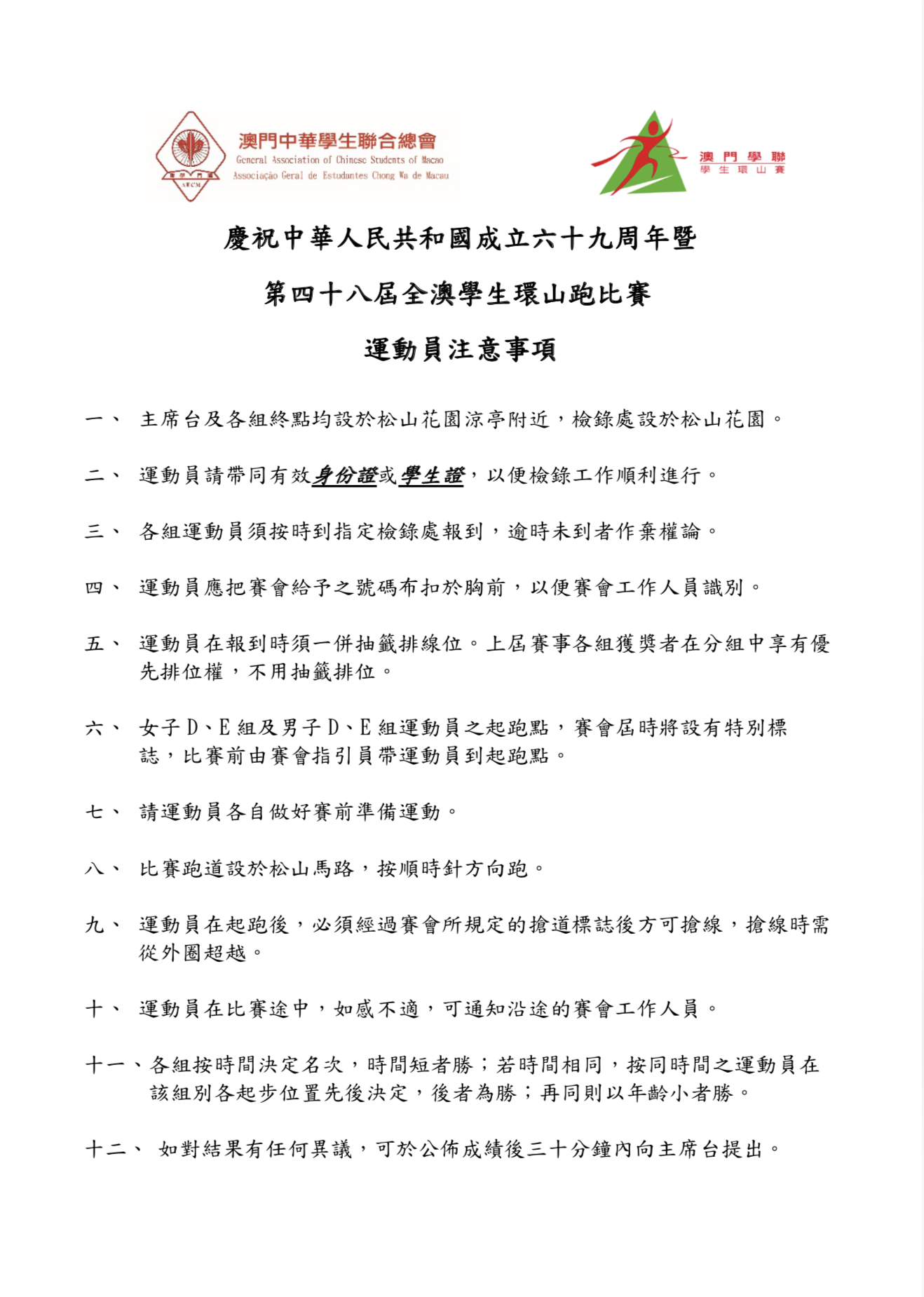 第四十八屆全澳學生環山跑比賽-章程