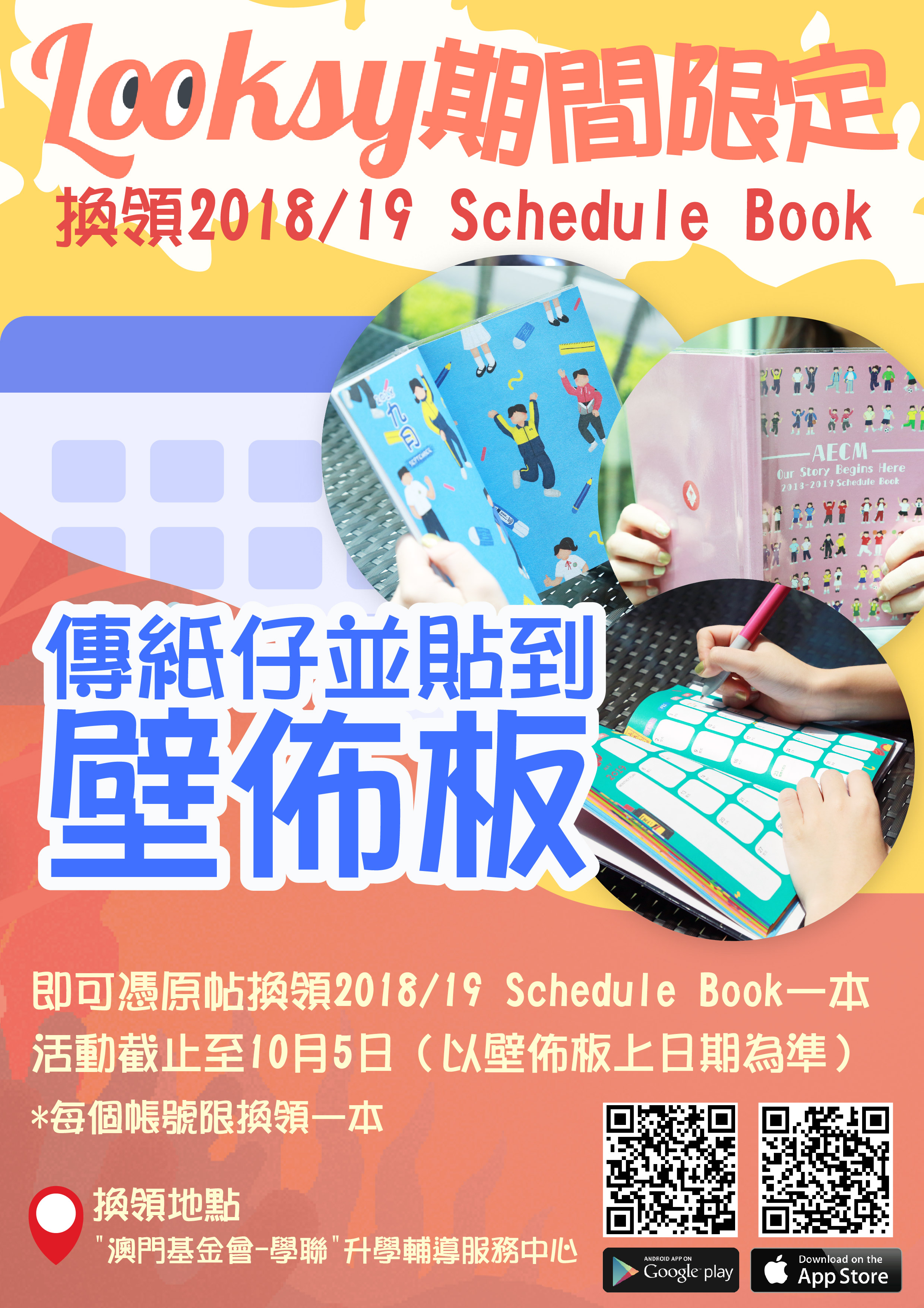 活動開始 09 / 21 活動完結 10 / 05 【推介】Looksy期間限定:2018/19 澳門學生Schedule Book 1【推介】Looksy期間限定:2018/19 澳門學生Schedule Book 2018/19 澳門學生Schedule Book登場啦! 就快就到2019年啦,你計劃好目標未呢? 今次內頁有驚喜,每一頁都有滿滿嘅校園回憶,仲可以欣賞各間中學嘅校服添! ❤️點樣先可以換到? 只要你係Looksy App上傳紙仔並貼到壁佈板即可憑原帖換領一本。 *每個帳號只限一本 ❤️活動時間 由即日起截止10月5日(以壁佈板日期為準) ❤️換領地點 “澳門基金會-學聯”升學輔導服務中心 澳門新口岸新填海區宋玉生廣場403至439號教科文中心二樓 手快有,手慢無呀!快啲貼壁報去換領啦! ReadMore 【會員福利】2026會員推薦「積」有禮 2026-04-16 【活動推介】國安智多Fun—線上互動遊戲 2026-04-15 【活動推介】我想拍片之模擬創投會(Pitching) 2026-04-08 Tweet 微信 Whatsapp 更多會員活動 2026年4月會訊 查看 【會員福利】2026會員推薦「積」有禮 查看 2026年3月會訊 查看 【會員小貼士】學聯會員登入平台操作5步曲 查看 【學聯會員有咩著數】 查看 【推介】加個好友吧 查看 組織 學聯 分類活動 發佈2018-09-21 微信 Whatsapp 焦點活動 Hot 澳門學聯七十五載愛國之路特刊 2025-04-30 【宣傳片】第二屆澳門青年國際禁毒大使培訓計劃 2026-01-09 【推介】2025/2026升學秘笈 2025-05-09 【形TV】〖校園狗仔隊〗EP64. 全運會空手道金牌得主:容君灝 澳門中華學生聯合總會