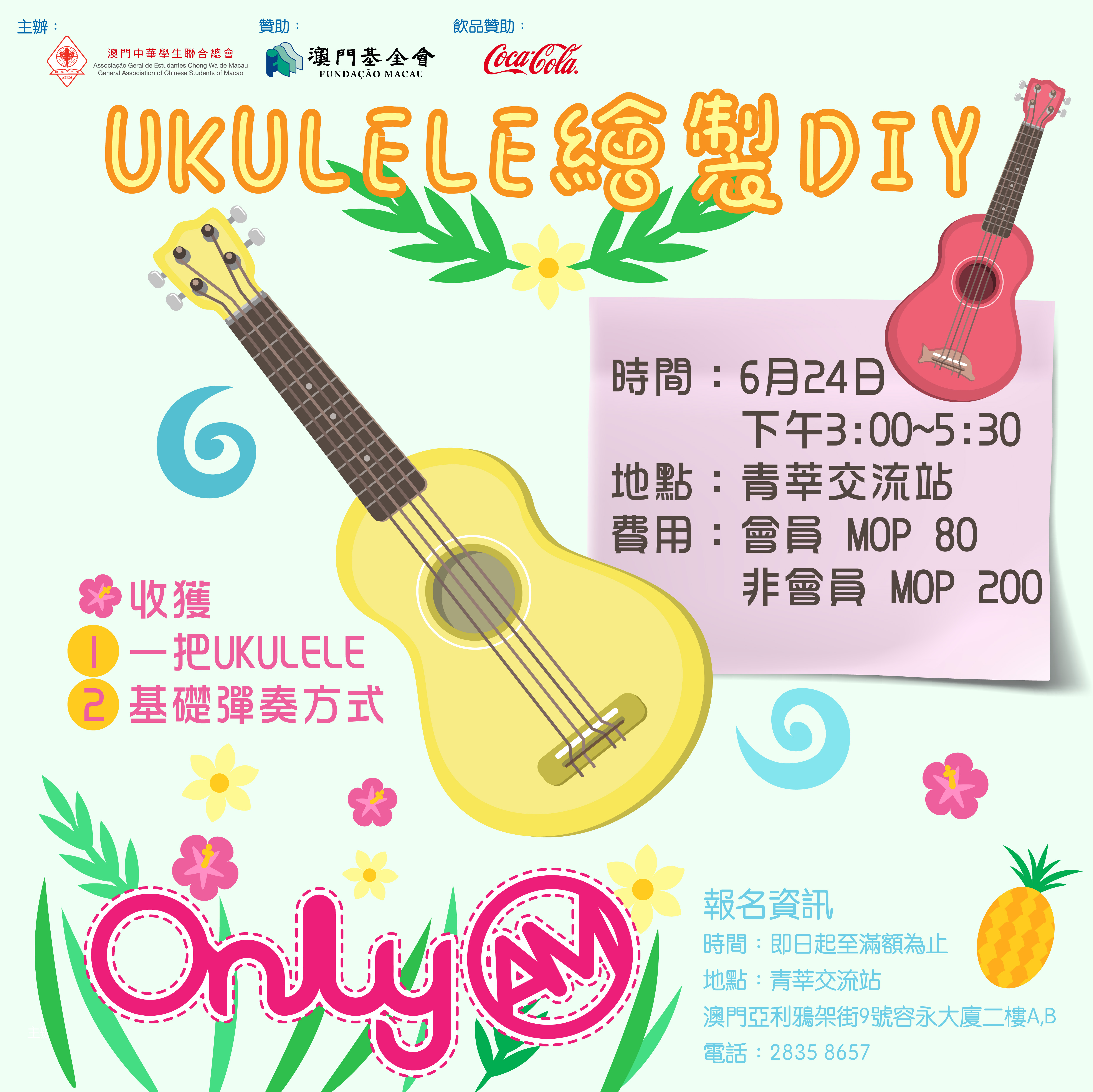 活動開始 06 / 09 活動完結 06 / 23 【推介】ONLY A.M.UKULELE繪製DIY 1【推介】ONLY A.M.UKULELE繪製DIY 如果人生要至少要學識一樣樂器, 相信烏克麗麗絕對係你最佳選擇~ 學識一種樂器,為生活加添韻味 超受歡迎的UKULELE繪製班又嚟啦~ 生活配點音樂,為自己送上一份開心愉悅的好心情! 簡單易學! 發揮小宇宙,製作獨一無二的烏克麗麗!! 即刻報名,成就UKULELE小樂手夢 ★收獲★ 1 一把UKULELE 2 基礎彈奏方式 ▶︎活動資訊 時間:6月24日 下午3:00~5:30 地點:青莘交流站 費用:會員 MOP 80 非會員 MOP 200 ReadMore 【會員福利】2026會員推薦「積」有禮 2026-04-16 【活動推介】國安智多Fun—線上互動遊戲 2026-04-15 【活動推介】我想拍片之模擬創投會(Pitching) 2026-04-08 Tweet 微信 Whatsapp 更多會員活動 2026年4月會訊 查看 【會員福利】2026會員推薦「積」有禮 查看 2026年3月會訊 查看 【會員小貼士】學聯會員登入平台操作5步曲 查看 【學聯會員有咩著數】 查看 【推介】加個好友吧 查看 組織 會員 分類活動 發佈2018-06-09 微信 Whatsapp 焦點活動 Hot 澳門學聯七十五載愛國之路特刊 2025-04-30 【宣傳片】第二屆澳門青年國際禁毒大使培訓計劃 2026-01-09 【推介】2025/2026升學秘笈 2025-05-09 【形TV】〖校園狗仔隊〗EP64. 全運會空手道金牌得主:容君灝 澳門中華學生聯合總會