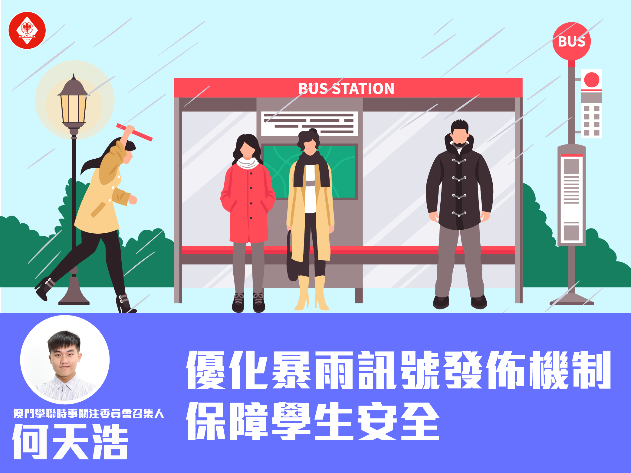 【新聞】優化暴雨訊號發佈機制 保障學生安全 近日澳門天氣不穩,雷雨頻繁,影響居民出行,尤其考驗氣象部門的預警能力。澳門學聯時事關注委員會召集人何天浩就此指出氣象部門除了擔當澳門氣象預測和氣象警告信號發佈的職能之外,更掌握着學校是否停課的「大權」。 回顧六月二十二日早上的一場暴雨,令眾多學生及家長狼狽不堪。氣象局於當日早上六時二十五分發佈預測訊息,表示未來兩小時可能出現大驟雨。此後,早上七時十分發出黃色暴雨信號,但當時雨勢已經足以造成低窪地區水浸,極大影響學生出行安全,但當局按照《暴雨警告信號系統》中所規定的標準,待到孫中山紀念公園氣象站錄得超過五十毫米雨量後,才在早上七時五十分發出紅色暴雨信號,但當時大多數學生已經在回校的路上,被迫陷入了「進退兩難」的地步,令學生及市民質疑暴雨訊號發佈機制的安排。 何天浩表示在現行機制之下,教青局只負責執行停課指引和發佈停課訊息,有關暴雨是否停課的訊息都是在氣象局決定發佈暴雨訊號後才會獲知,因此往往訊息發佈總是氣象局優先,教青局相隔大約十分鐘才會發佈。在一些尷尬時段,例如六月二十二日暴雨當中,若果氣象局發佈時間接近上學時間,其他有關部門就無法有足夠的反應時間通知社會大眾,部份需要提早出門的學生,例如:跨境學童、距離學校偏遠的學生,便會受到極大影響。 因此優化暴雨警告訊號發佈機制「刻不容緩」,何天浩建議氣象局應持續優化暴雨訊號機制,例如:加入人性化考量因素 (是否足以造成水浸)、預測未來雨勢發展提前作訊號發佈及與教青局建立預先通報機制,確保訊息發佈及時恰當,保障學生能夠在安全的情況下上學。 ReadMore 【社諮委】蕭顯華:多措並舉優化巴士乘搭體驗 2026-03-06 【社諮委】阮舒淇:持續打擊電訊詐騙犯罪 2026-03-06 【基層呼聲】學聯新閣凝心聚力 立足澳門 橋接世界 2026-02-25 Tweet 微信 Whatsapp 更多會員活動 2026年4月會訊 查看 【會員福利】2026會員推薦「積」有禮 查看 2026年3月會訊 查看 【會員小貼士】學聯會員登入平台操作5步曲 查看 【學聯會員有咩著數】 查看 【推介】加個好友吧 查看 分類新聞稿, 時事 發佈2021-06-24 微信 Whatsapp 焦點活動 Hot 澳門學聯七十五載愛國之路特刊 2025-04-30 【宣傳片】第二屆澳門青年國際禁毒大使培訓計劃 2026-01-09 【推介】2025/2026升學秘笈 2025-05-09 【形TV】〖校園狗仔隊〗EP64. 全運會空手道金牌得主:容君灝 澳門中華學生聯合總會