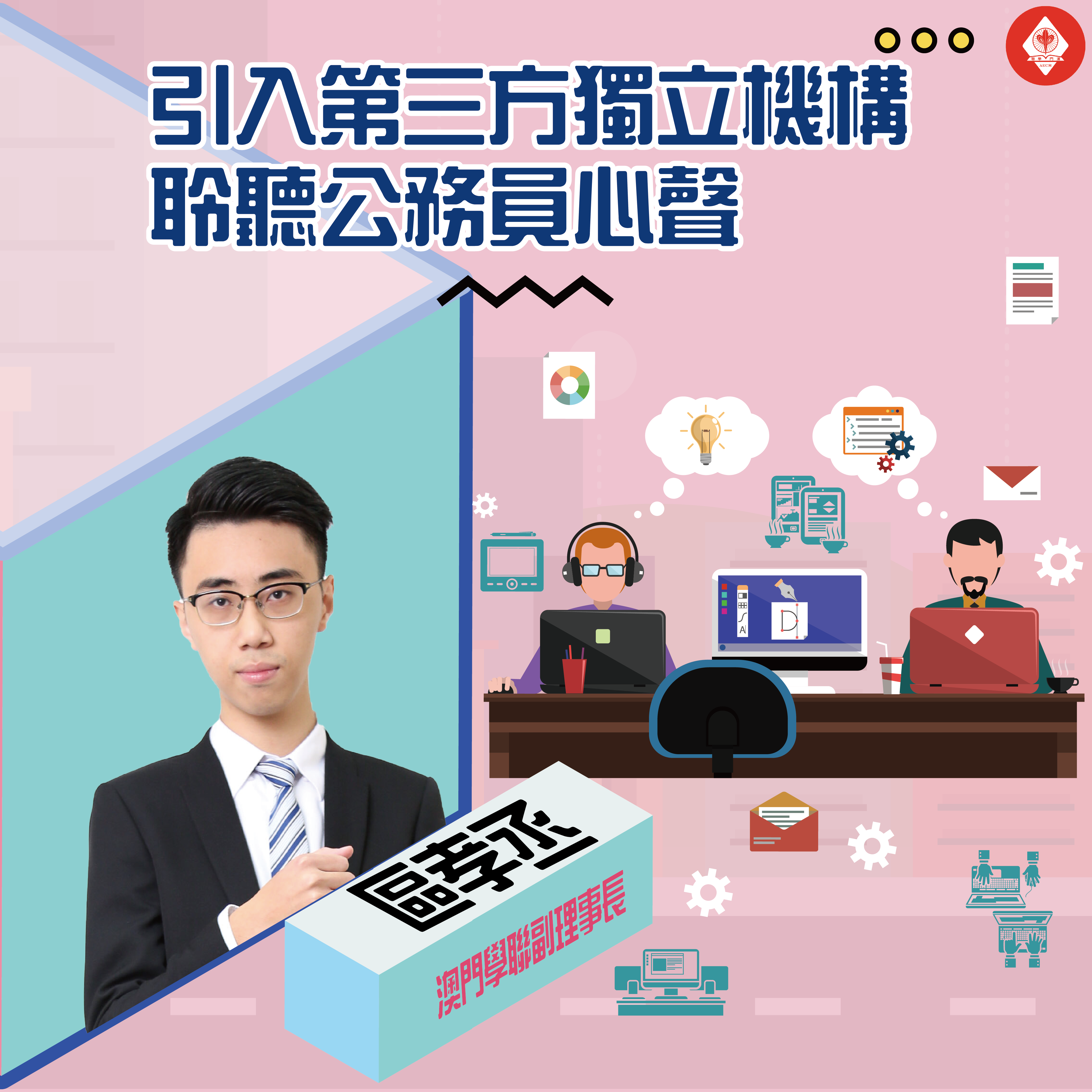 現時,澳門的公務員團隊成員,如果對工作上出現問題,可根據現行的投訴制度向政府反映。該制度保障了公務人員提出投訴的權利,並使政府能夠公正處理有關投訴。當中規定公務人員須實名提出投訴,但公務人員面對的問題往往不便主動以實名反映,而且亦有一些並非投訴的意見,而是對實務工作的反思與看法。因此,建議政府可引入獨立的第三方機構,主動收集公務員日常工作中的意見;持續優化公務人員的工作,強化政府服務,使政府能更有效服務市民。