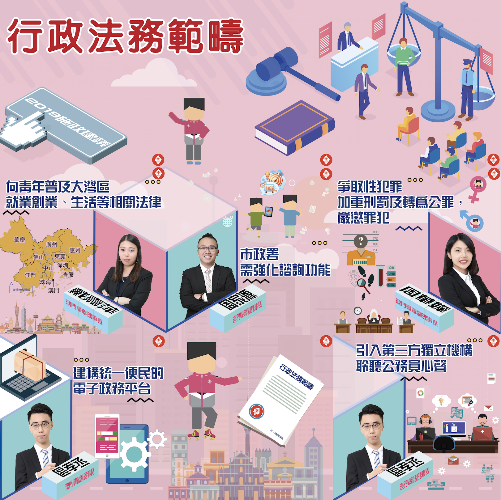 所謂普及法律,不但是要人守法,更重要是要讓居民理解法律的基本概念,例如法治精神、司法制度等。要在澳門推動普及法律工作,中小學是最佳場所,塑造識法守法的新一代,令澳門的普法工作有更佳的成果。另一方面,因應粵港澳大灣區規劃即將落實,在可見的將來會有不少澳門青年到大灣區長期生活。故此,特區政府的普及法律工作亦可配合這個趨勢,向青年說明大灣區內的法律法規,為青年進入大灣區發展做好準備。