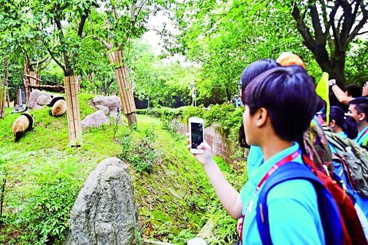 夏令營一行五十多人今日上午參觀了成都大熊貓繁殖研究基地。基地專門從事瀕危野生物研究、繁殖、保護教育和教育旅遊的非營利機構,現時大熊貓圈養種群數量約有七十隻。團員從竹林中近距離觀賞到或散步、或吃竹、或搔癢、或發呆、或打鬧的大熊貓,還能一睹保育箱中熊貓寶寶的容貌,可愛的熊貓引得團員驚叫連連,紛紛拍照記下難得瞬間。下午,一行人乘車前往位於廣漢的三星堆博物館,了解距今四千多年前,曾經輝煌一時、充滿智慧的古蜀國文明。