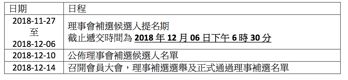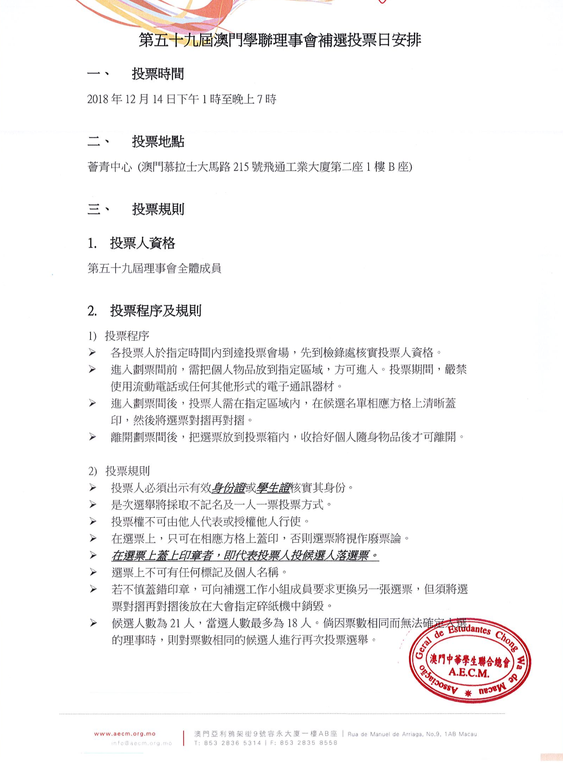 因應澳門學聯第五十九屆理事會部分理事到外地升學或畢業而未能承擔會務工作,為令會務 順利進行,現有關澳門學聯第五十九屆理事會的補選工作已展開,如大家或身邊朋友有意加 入學聯,可透過提名參與選舉。關於補選的規模及其產生辦法,請參閱附件《第五十九屆澳 門學聯理事會補選章程及理事會補選工作日程》,同時填妥《第五十九屆澳門學聯理事會補 選提名表》,提名期由十一月二十七日開始,至十二月六日下午六時三十分結束。提名表請遞 交至:澳門亞利鴉架街 9 號容永大廈一樓(澳門中華學生聯合總會)