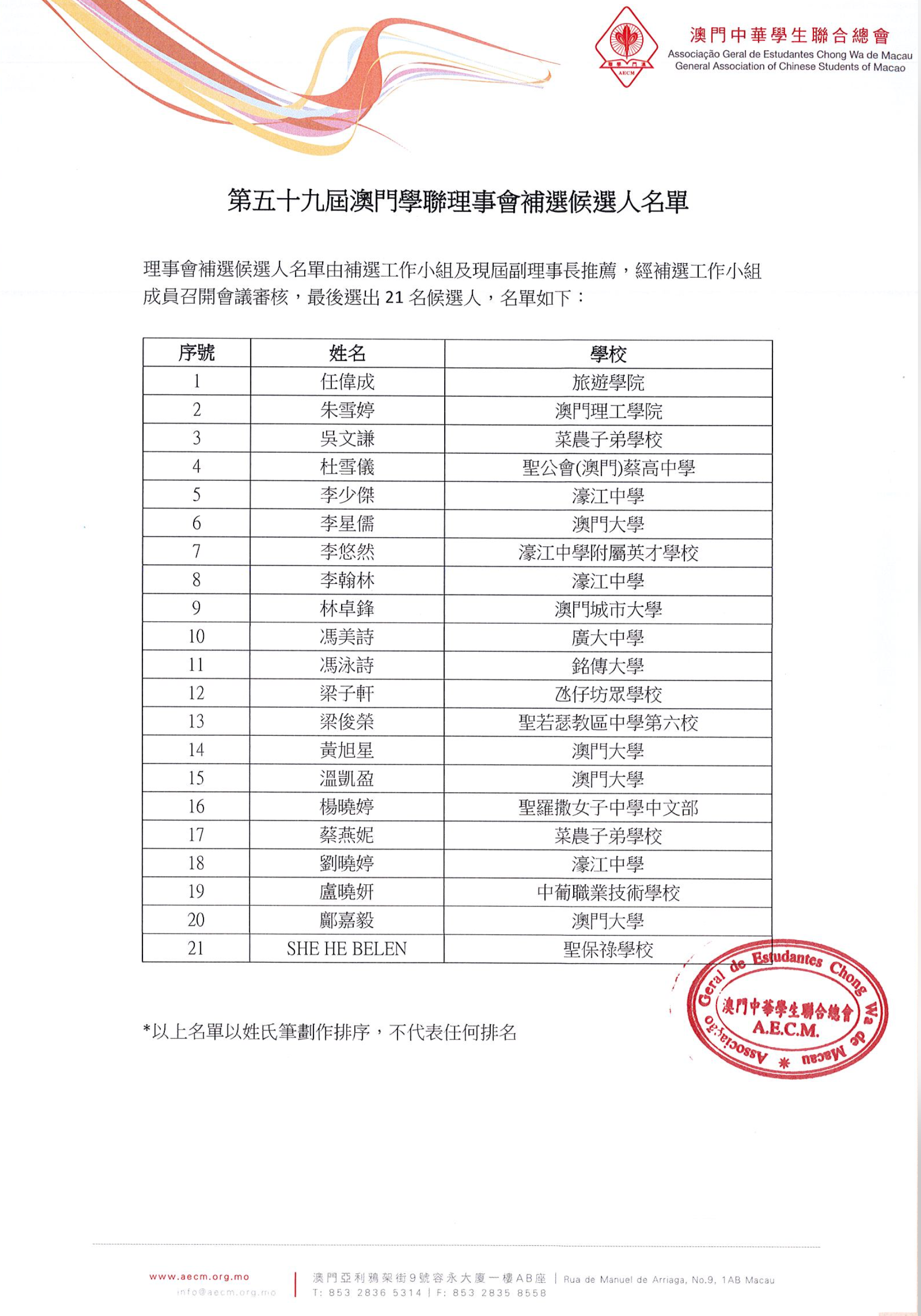 1第五十九屆澳門學聯理事會補選名單公佈
