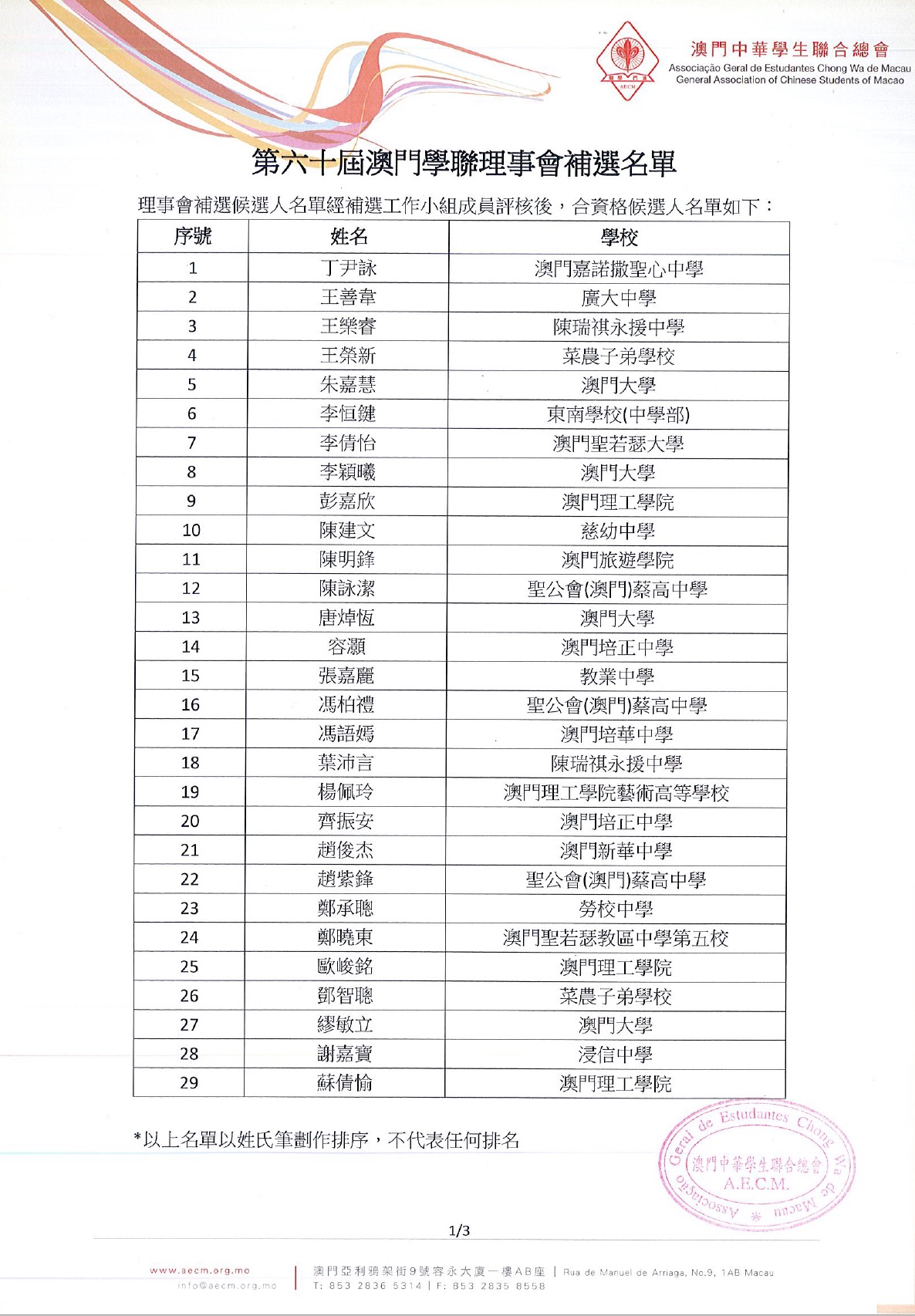 1第六十屆澳門學聯理事會補選名單公佈