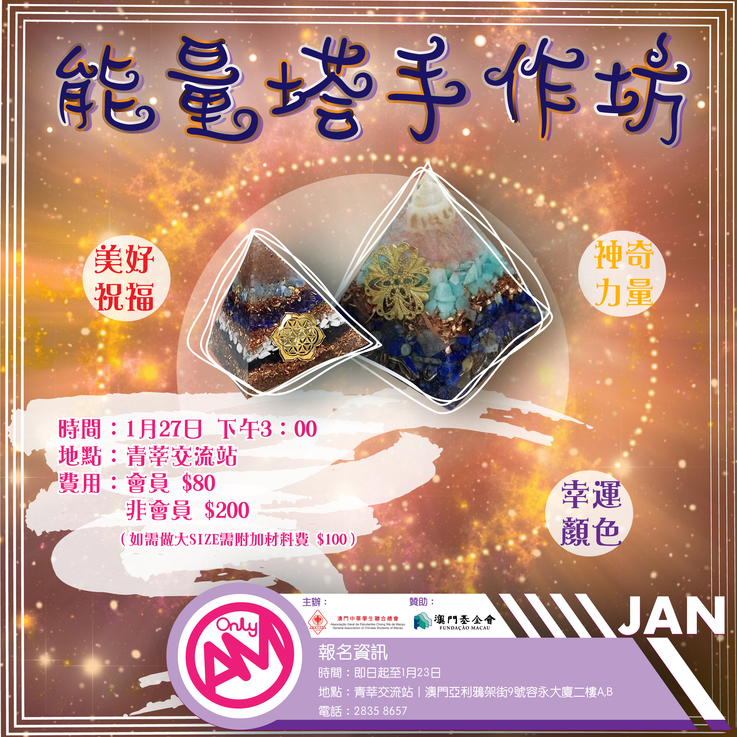 活動開始 01 / 14 活動完結 01 / 31 【1月會員活動】Only A.M. 能量塔手作坊 1【1月會員活動】Only A.M. 能量塔手作坊 屬於你的能量金字塔 2019已經到左了, 新一年,芳芳想給大家一個美好的祝福! 1月會員活動,將會手把手教大家做一個屬於自己獨一無二嘅能量金字塔!! 送人自用都好啱用架! -活動資訊- 時間:1月27日 下午3:00 地點:青莘交流站 費用:會員 $80 非會員 $200 (如需做大SIZE需附加材料費 $100) -報名資訊- 時間:即日起至1月23日 地點:青莘交流站|澳門亞利鴉架街9號容永大廈二樓A,B 電話:2835 8657 ReadMore 【會員福利】2026會員推薦「積」有禮 2026-04-16 【活動推介】國安智多Fun—線上互動遊戲 2026-04-15 【活動推介】我想拍片之模擬創投會(Pitching) 2026-04-08 Tweet 微信 Whatsapp 更多會員活動 2026年4月會訊 查看 【會員福利】2026會員推薦「積」有禮 查看 2026年3月會訊 查看 【會員小貼士】學聯會員登入平台操作5步曲 查看 【學聯會員有咩著數】 查看 【推介】加個好友吧 查看 組織 會員 分類活動 標籤, ONLY A.M., Only A.M.會員系列活動 發佈2019-01-14 微信 Whatsapp 焦點活動 Hot 澳門學聯七十五載愛國之路特刊 2025-04-30 【宣傳片】第二屆澳門青年國際禁毒大使培訓計劃 2026-01-09 【推介】2025/2026升學秘笈 2025-05-09 【形TV】〖校園狗仔隊〗EP64. 全運會空手道金牌得主:容君灝 澳門中華學生聯合總會