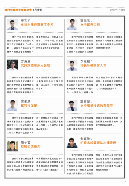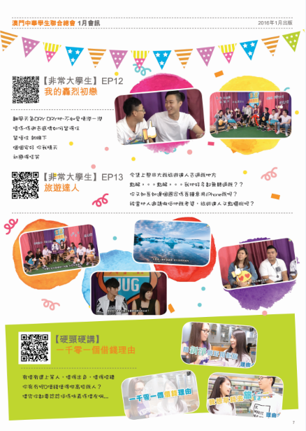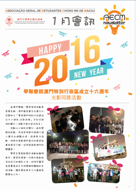 一月會訊 ReadMore 2026年4月會訊 2026-04-16 2026年3月會訊 2026-03-24 2026年2月會訊 2026-02-14 Tweet 微信 Whatsapp 更多會員活動 2026年4月會訊 查看 【會員福利】2026會員推薦「積」有禮 查看 2026年3月會訊 查看 【會員小貼士】學聯會員登入平台操作5步曲 查看 【學聯會員有咩著數】 查看 【推介】加個好友吧 查看 組織 學聯 分類會訊 發佈2016-01-15 微信 Whatsapp 焦點活動 Hot 澳門學聯七十五載愛國之路特刊 2025-04-30 【宣傳片】第二屆澳門青年國際禁毒大使培訓計劃 2026-01-09 【推介】2025/2026升學秘笈 2025-05-09 【形TV】〖校園狗仔隊〗EP64. 全運會空手道金牌得主:容君灝 澳門中華學生聯合總會