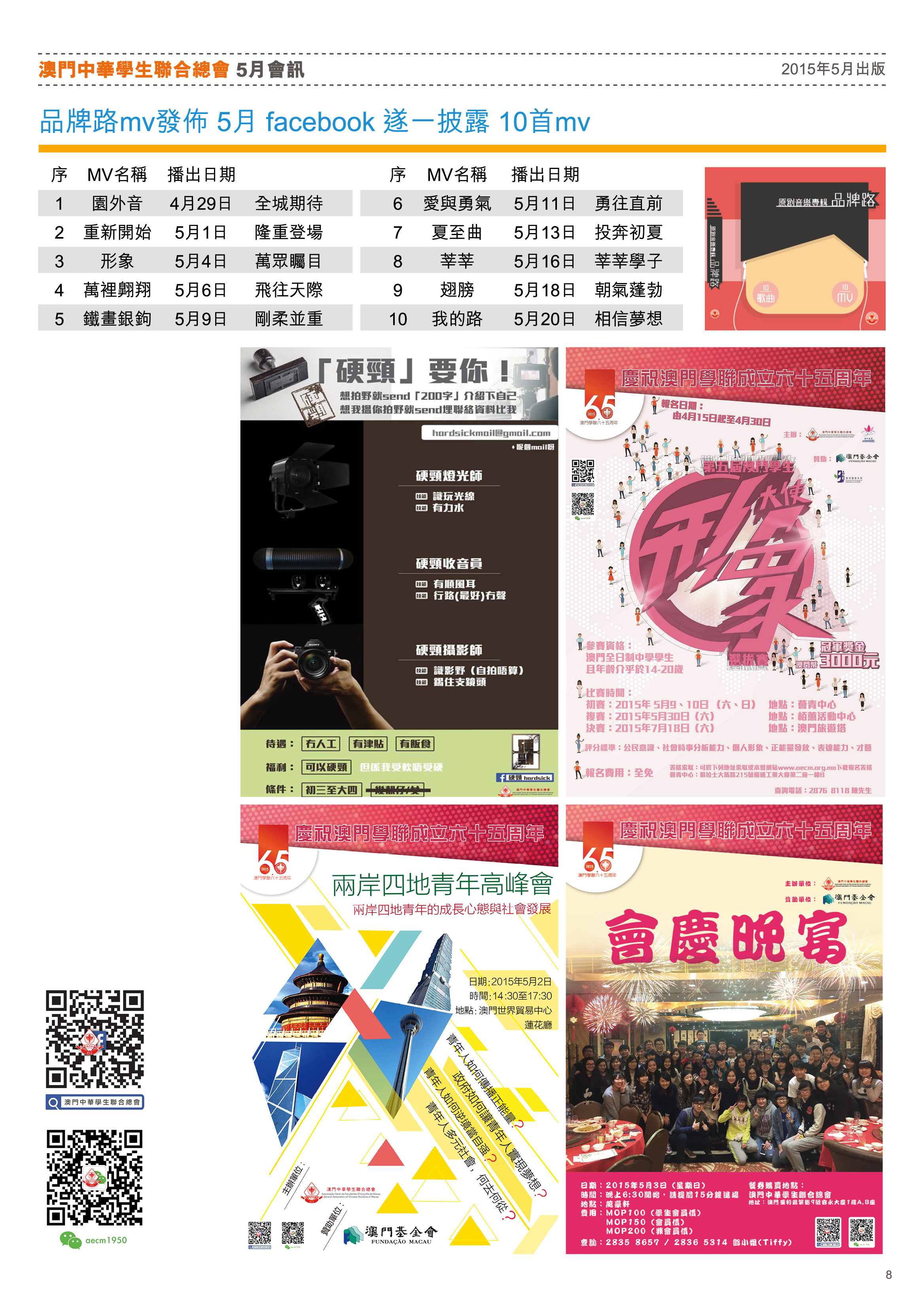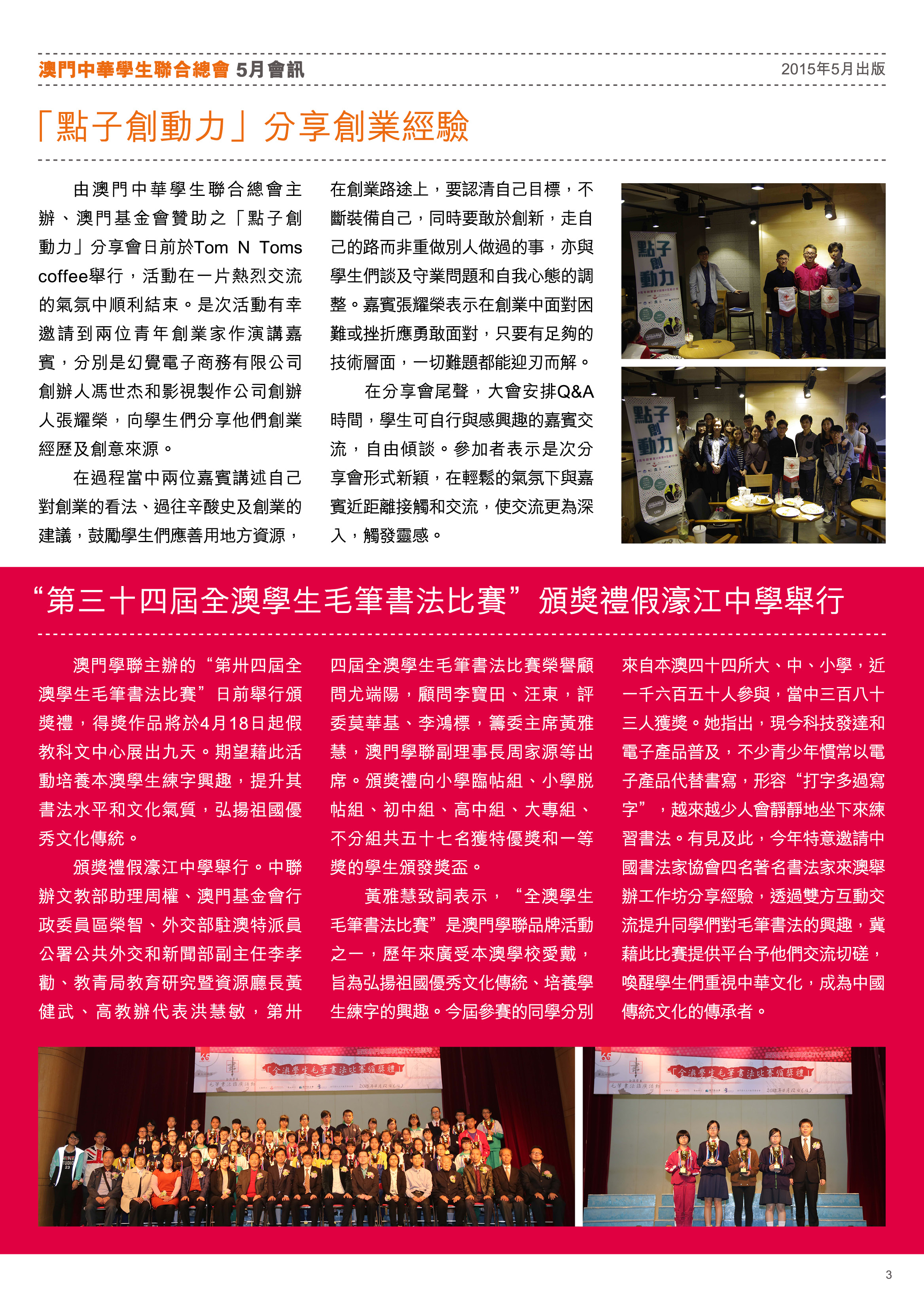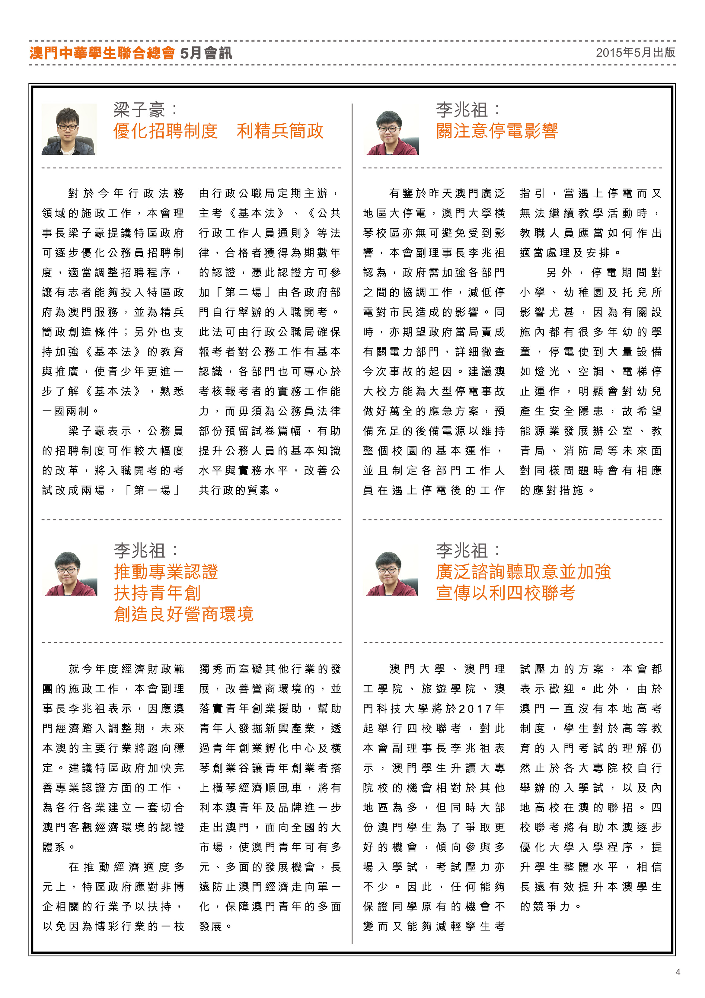 五月會訊 ReadMore 2026年4月會訊 2026-04-16 2026年3月會訊 2026-03-24 2026年2月會訊 2026-02-14 Tweet 微信 Whatsapp 更多會員活動 2026年4月會訊 查看 【會員福利】2026會員推薦「積」有禮 查看 2026年3月會訊 查看 【會員小貼士】學聯會員登入平台操作5步曲 查看 【學聯會員有咩著數】 查看 【推介】加個好友吧 查看 分類出版, 會訊 發佈2015-05-14 微信 Whatsapp 焦點活動 Hot 澳門學聯七十五載愛國之路特刊 2025-04-30 【宣傳片】第二屆澳門青年國際禁毒大使培訓計劃 2026-01-09 【推介】2025/2026升學秘笈 2025-05-09 【形TV】〖校園狗仔隊〗EP64. 全運會空手道金牌得主:容君灝 澳門中華學生聯合總會