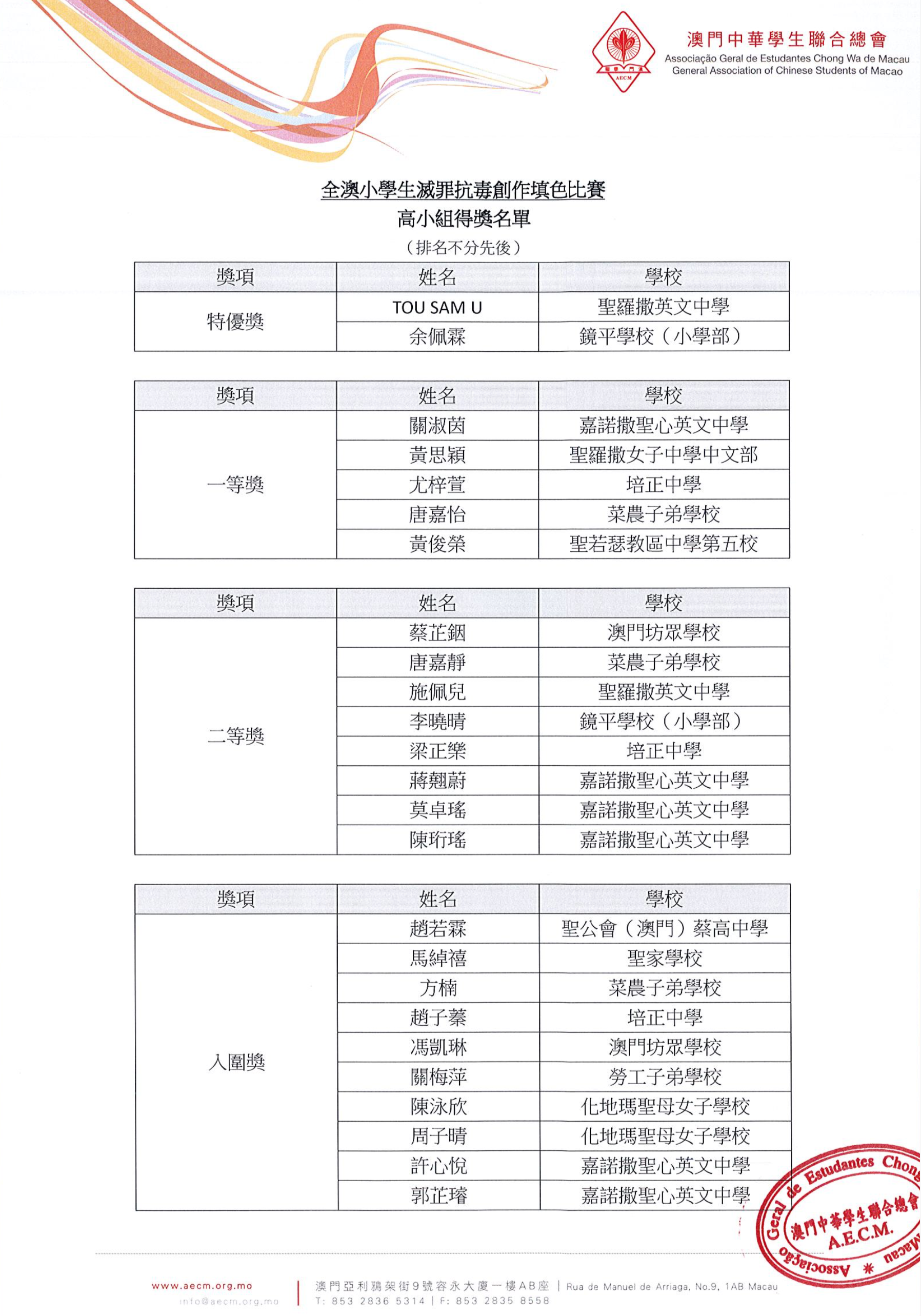 經主辦及協辦單位代表的評選後,兩個組別共選出五十份得獎作品,包括各組別特優獎兩名、一等獎五名、二等獎八名及入圍獎十名,得獎名單已上載至澳門學聯網站(www.aecm.org.mo)。獎項將於11月25日假駿菁活動中心舉行之「2018澳門學聯少訊結業禮」上頒發,如有查詢,可致電28768118與潘小姐聯絡。