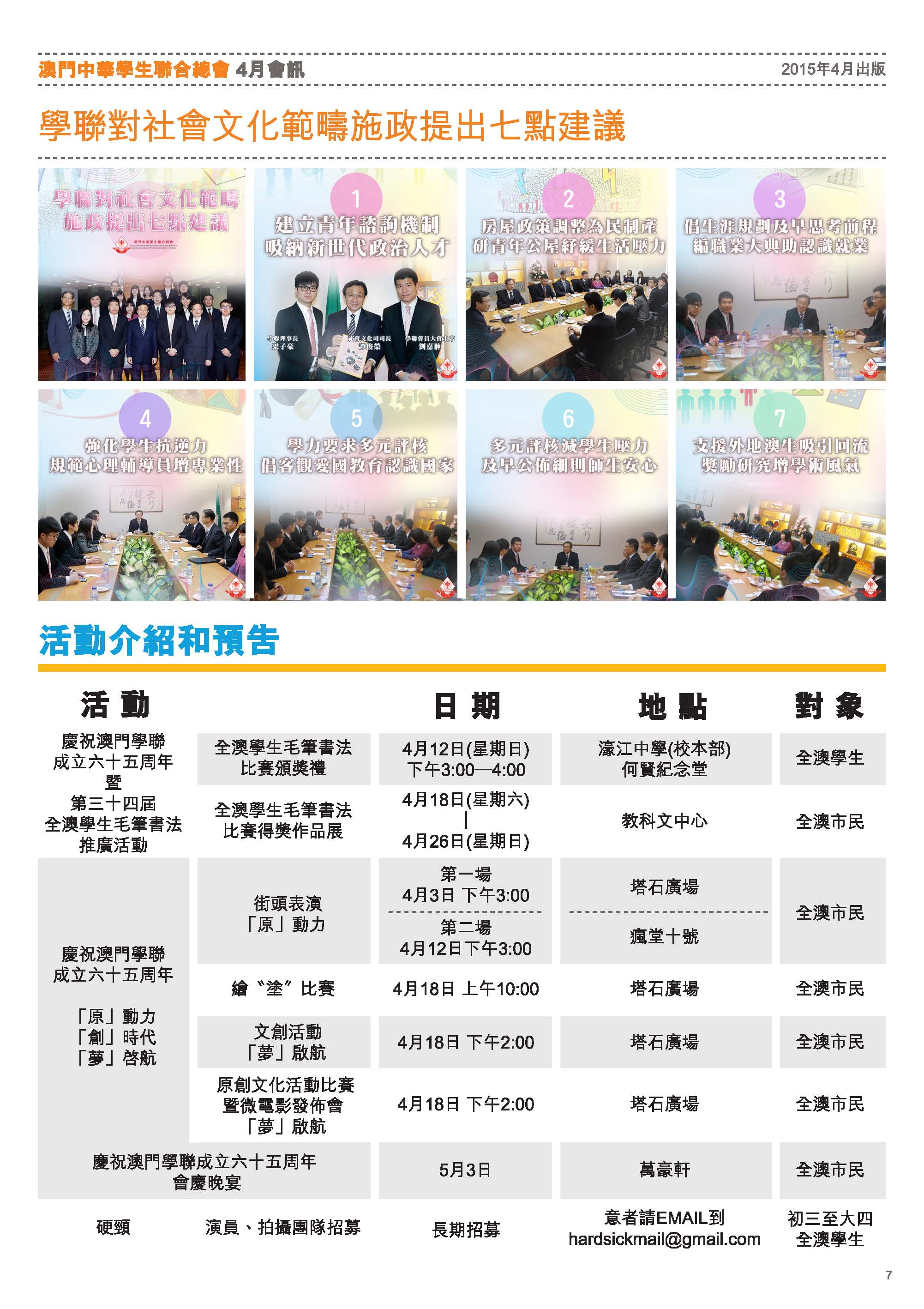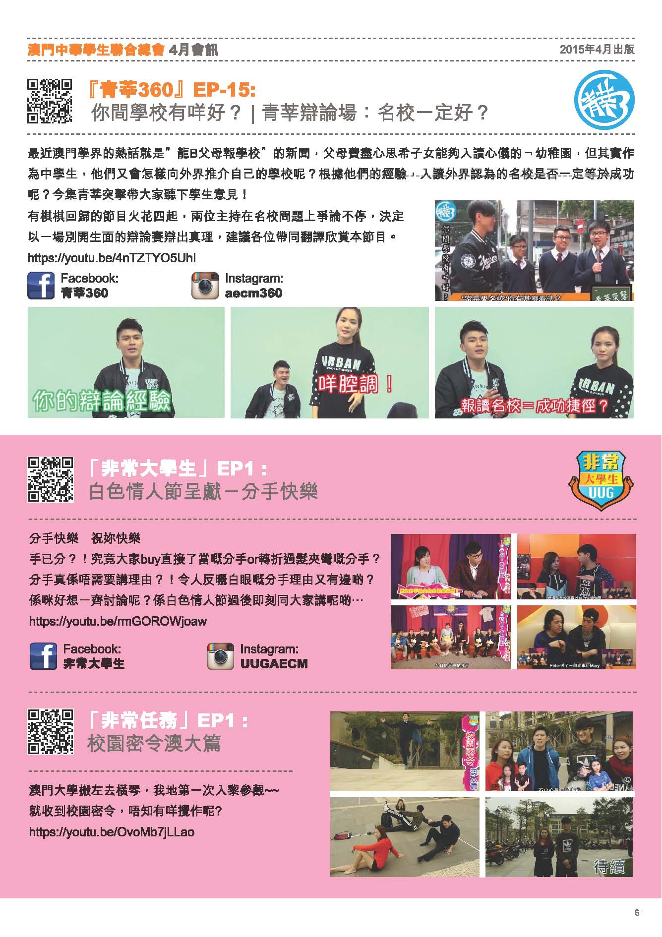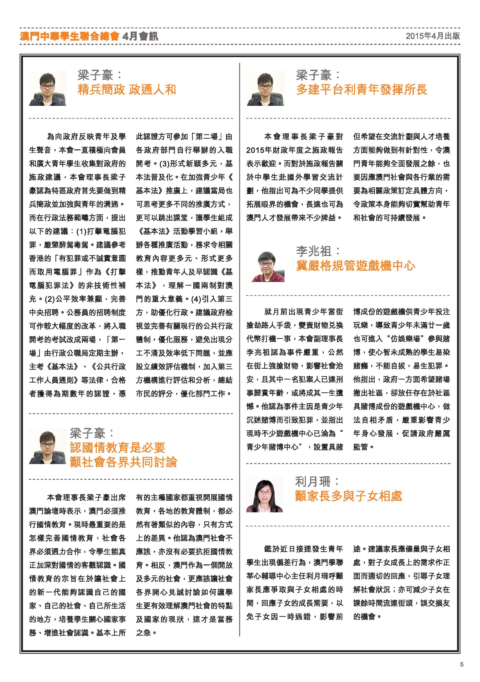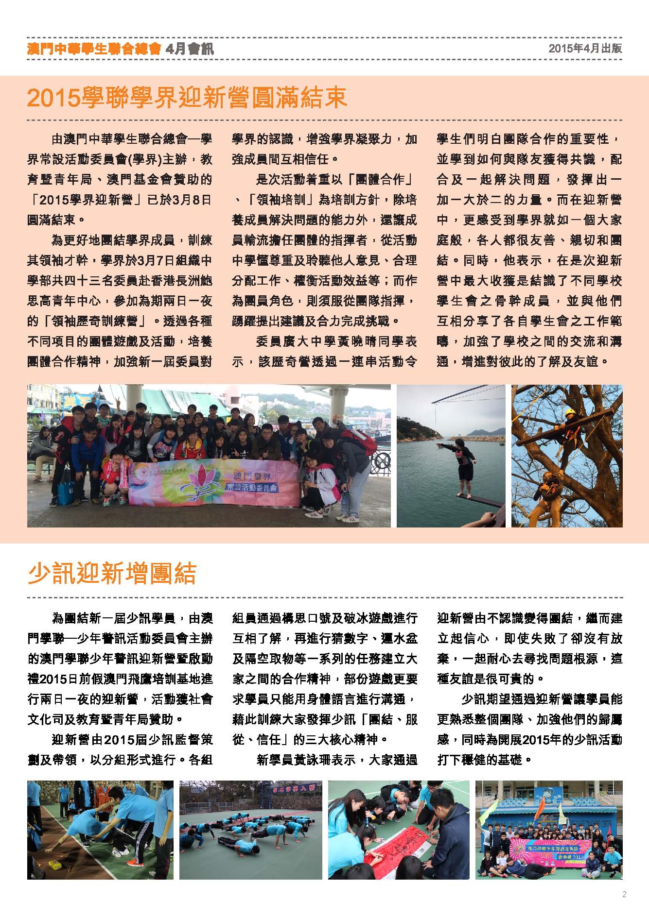 四月會訊 ReadMore 2026年4月會訊 2026-04-16 2026年3月會訊 2026-03-24 2026年2月會訊 2026-02-14 Tweet 微信 Whatsapp 更多會員活動 2026年4月會訊 查看 【會員福利】2026會員推薦「積」有禮 查看 2026年3月會訊 查看 【會員小貼士】學聯會員登入平台操作5步曲 查看 【學聯會員有咩著數】 查看 【推介】加個好友吧 查看 分類出版, 會訊 發佈2015-04-02 微信 Whatsapp 焦點活動 Hot 澳門學聯七十五載愛國之路特刊 2025-04-30 【宣傳片】第二屆澳門青年國際禁毒大使培訓計劃 2026-01-09 【推介】2025/2026升學秘笈 2025-05-09 【形TV】〖校園狗仔隊〗EP64. 全運會空手道金牌得主:容君灝 澳門中華學生聯合總會