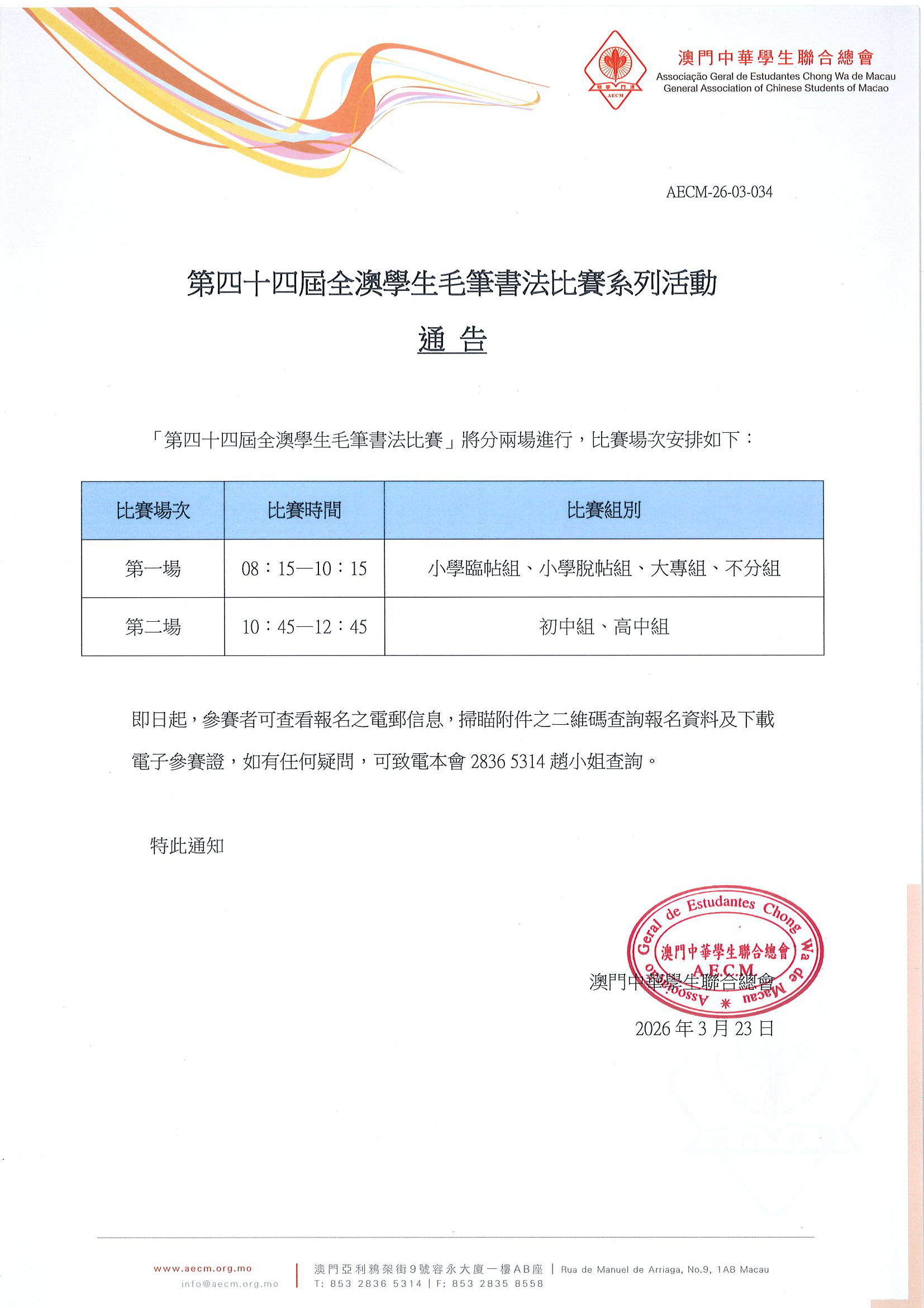 2【場地通告】第四十四屆全澳學生毛筆書法比賽系列活動