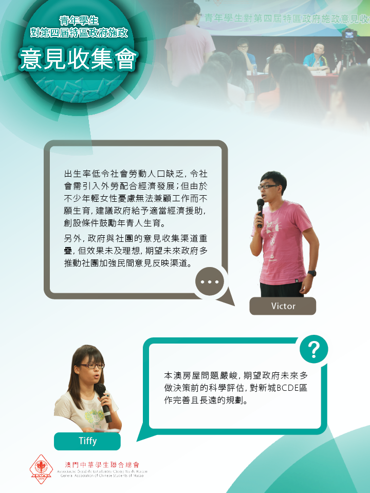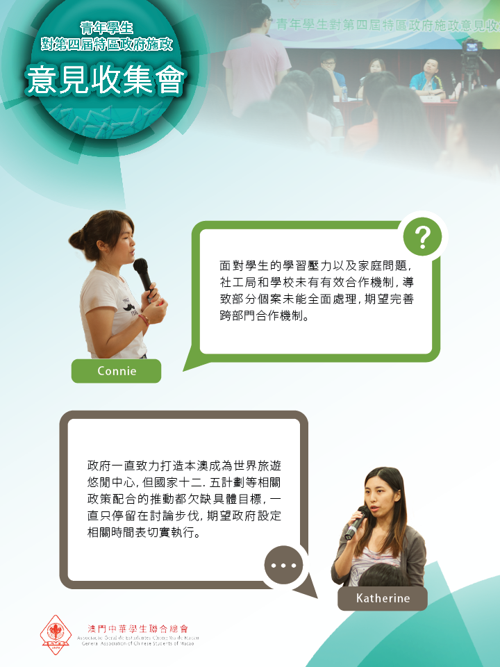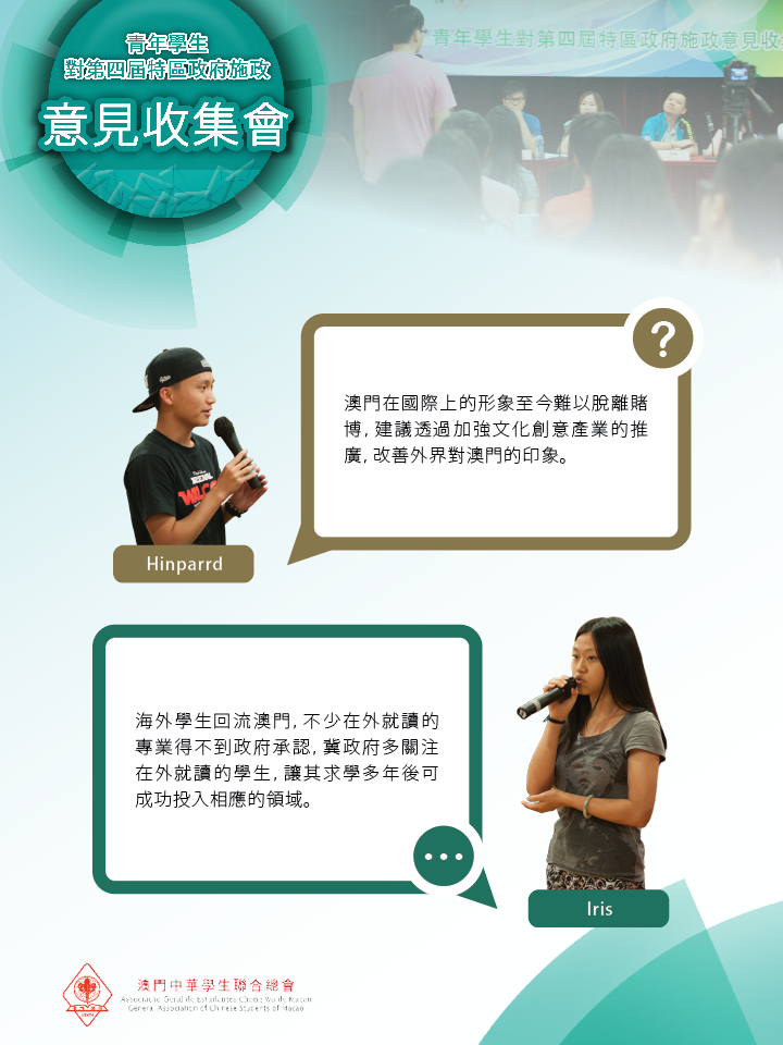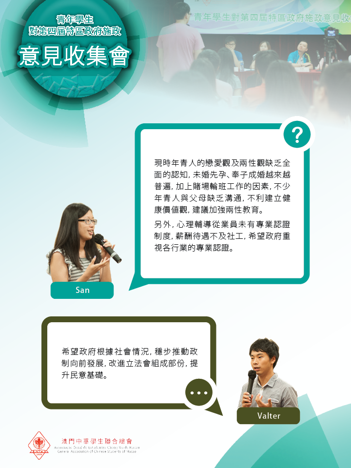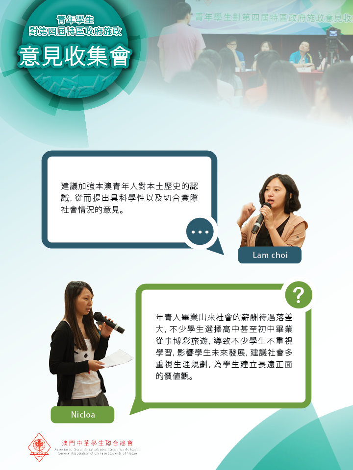 [青年學生對第四屆特區政府施政]-意見收集會 1[青年學生對第四屆特區政府施政]-意見收集會 十位有抱負的青年學生,向行政長官選委發表自己對特區政府施政的想法,希望透過學聯將自己的意見傳達新一屆行政長官,優化政府施政,為澳門盡一分力。 一起看看十位青年學生的想法。 ReadMore 【活動推介】我想拍片之模擬創投會(Pitching) 2026-04-08 【會員小貼士】學聯會員登入平台操作5步曲 2026-03-19 【學聯會員有咩著數】 2026-03-19 Tweet 微信 Whatsapp 更多會員活動 【2026年3月會訊】藝韻揚正氣 ,青春展芳華 查看 【會員小貼士】學聯會員登入平台操作5步曲 查看 【學聯會員有咩著數】 查看 【推介】加個好友吧 查看 2026拍攝沖印服務 查看 2026年2月會訊 查看 組織 學聯 分類時事, 時事關注, 活動, 活動花絮 發佈2014-08-29 微信 Whatsapp 焦點活動 Hot 澳門學聯七十五載愛國之路特刊 2025-04-30 【宣傳片】第二屆澳門青年國際禁毒大使培訓計劃 2026-01-09 【推介】2025/2026升學秘笈 2025-05-09 【形TV】〖校園狗仔隊〗EP64. 全運會空手道金牌得主:容君灝 澳門中華學生聯合總會