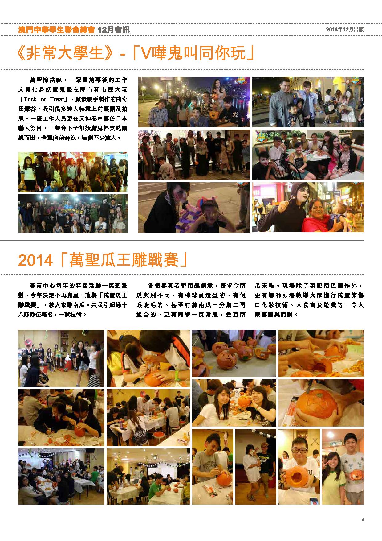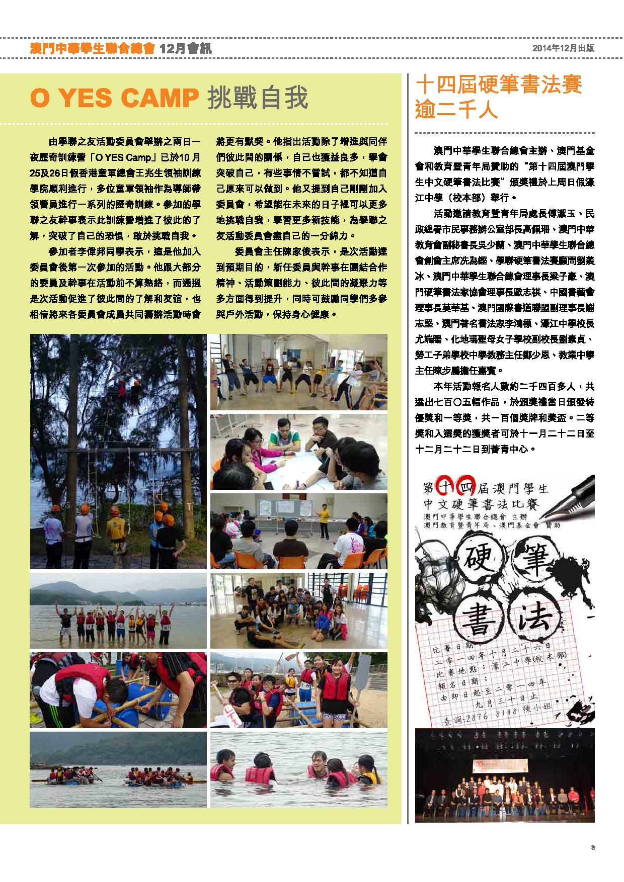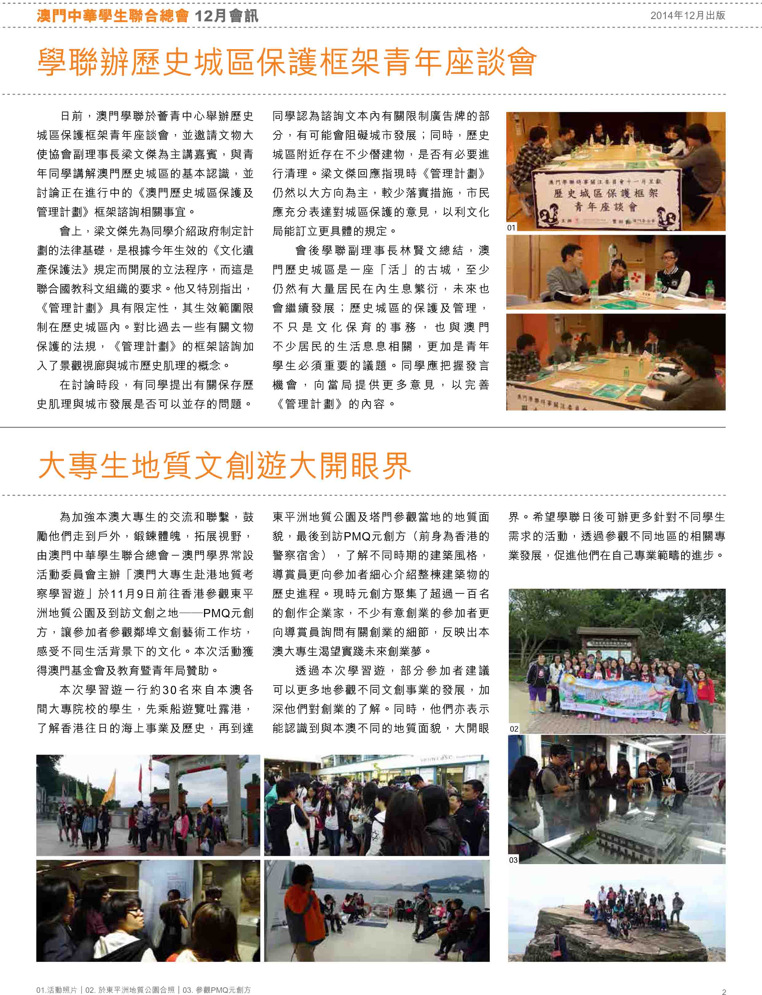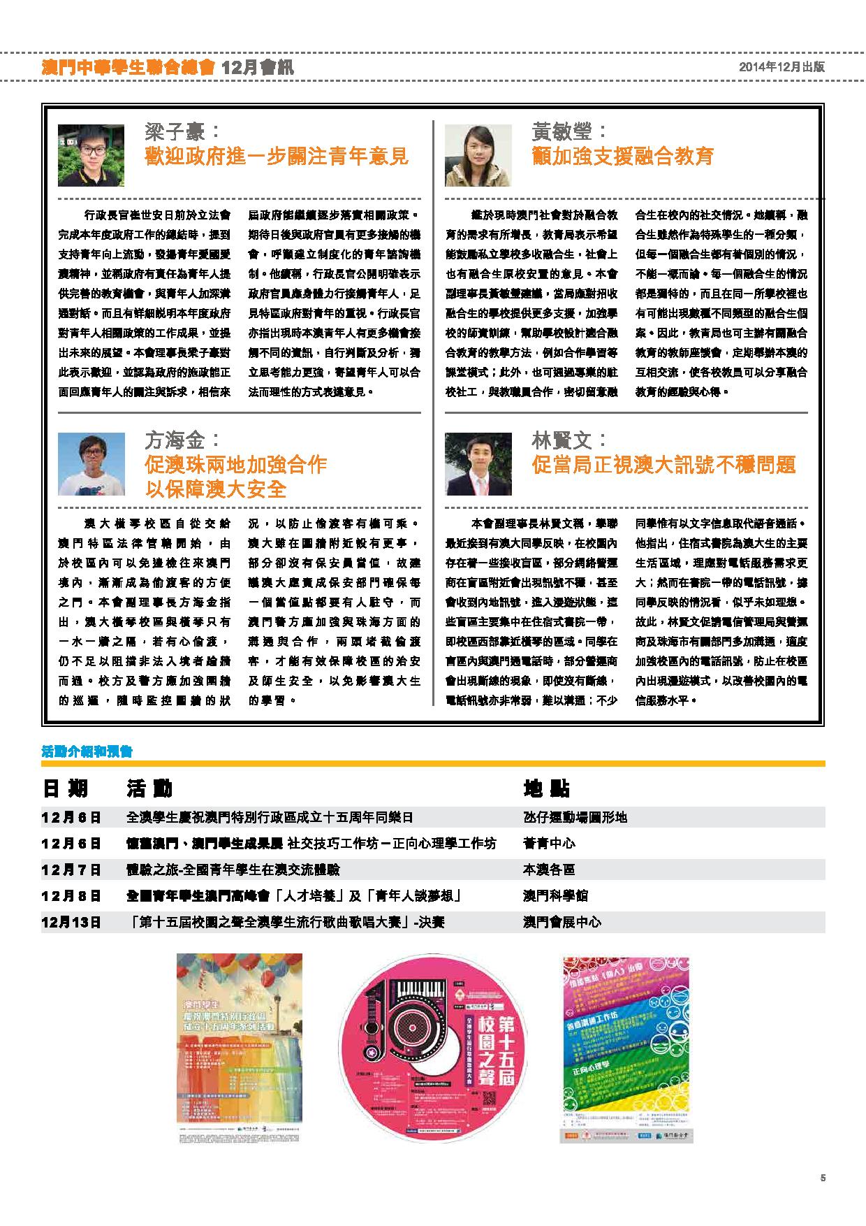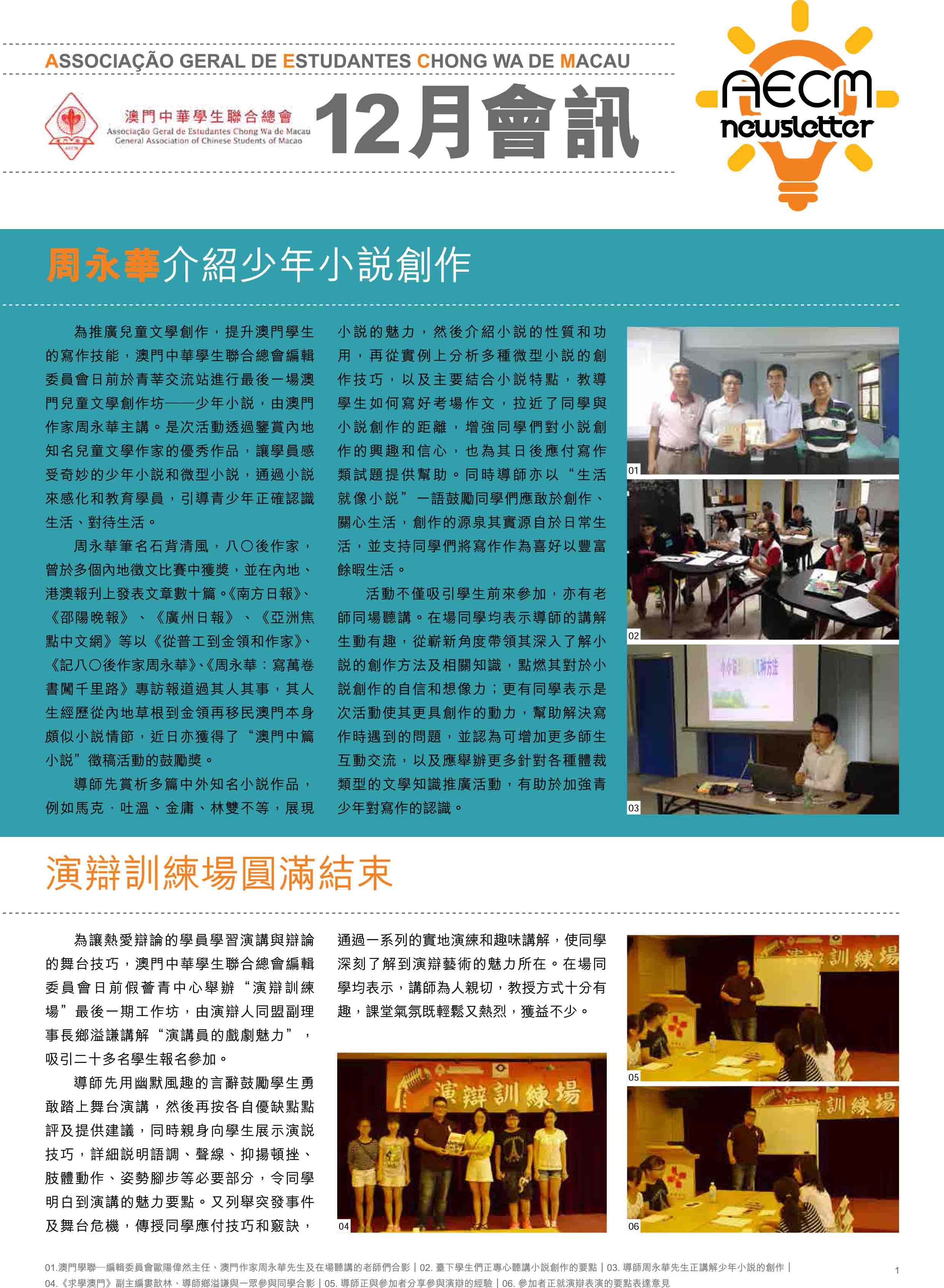 十二月會訊 ReadMore 2026年4月會訊 2026-04-16 2026年3月會訊 2026-03-24 2026年2月會訊 2026-02-14 Tweet 微信 Whatsapp 更多會員活動 2026年4月會訊 查看 【會員福利】2026會員推薦「積」有禮 查看 2026年3月會訊 查看 【會員小貼士】學聯會員登入平台操作5步曲 查看 【學聯會員有咩著數】 查看 【推介】加個好友吧 查看 分類出版, 會訊 發佈2014-12-01 微信 Whatsapp 焦點活動 Hot 澳門學聯七十五載愛國之路特刊 2025-04-30 【宣傳片】第二屆澳門青年國際禁毒大使培訓計劃 2026-01-09 【推介】2025/2026升學秘笈 2025-05-09 【形TV】〖校園狗仔隊〗EP64. 全運會空手道金牌得主:容君灝 澳門中華學生聯合總會