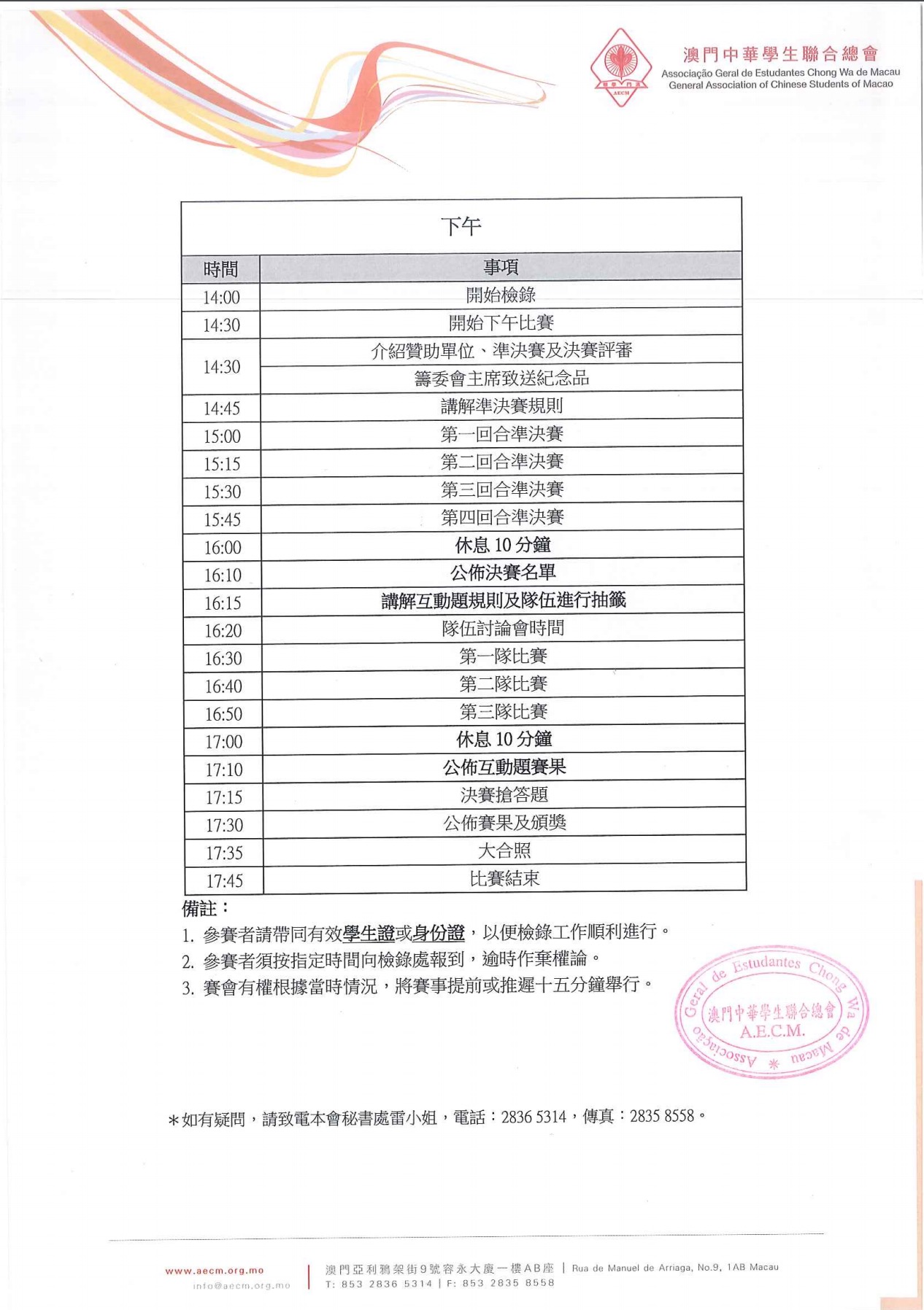 查詢:詳情瀏覽澳門學聯網站www.aecm.org.mo或致電2836 5314 聯絡人:雷小姐。