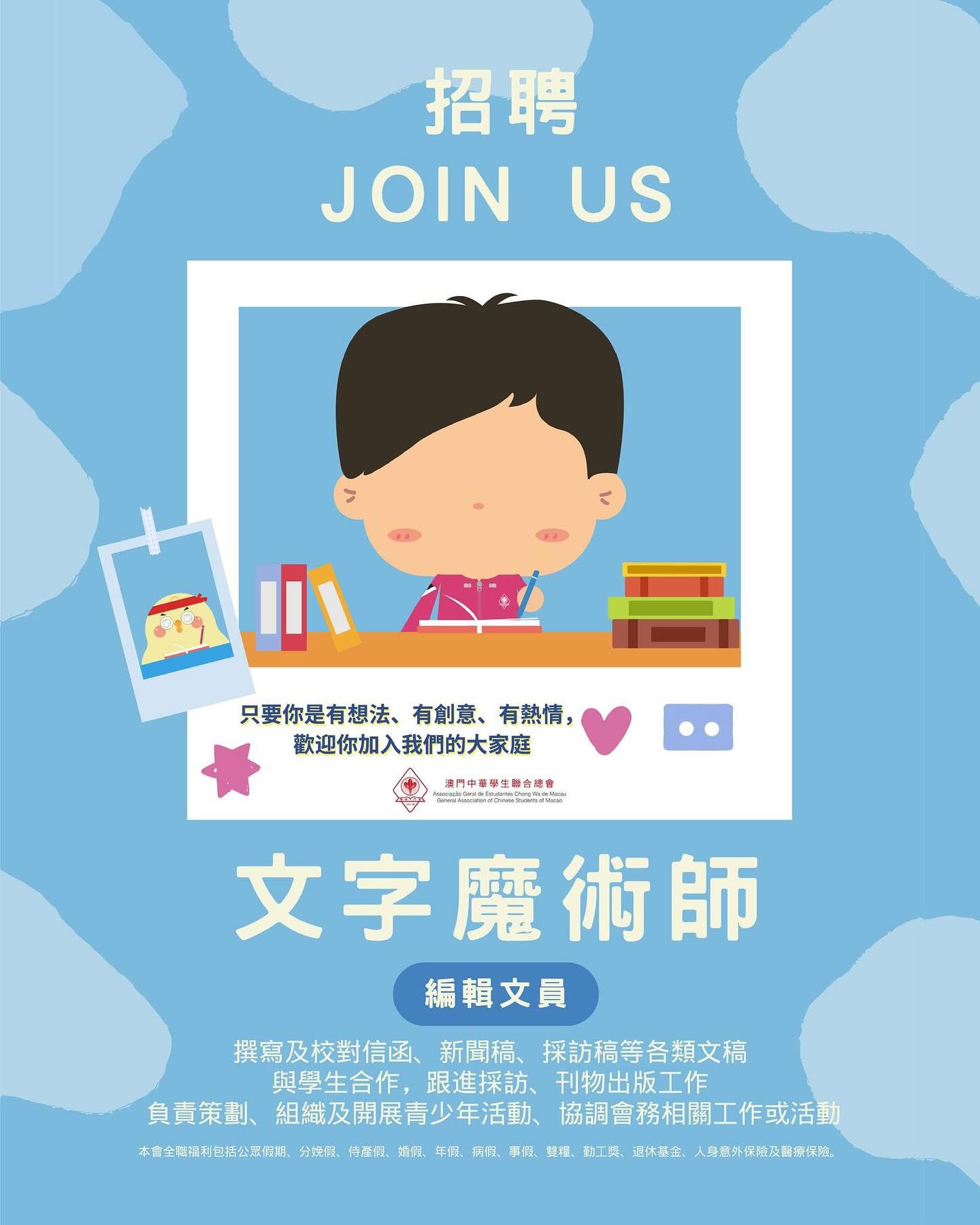 優先條件: 1. 具中文、中國語文專業、出版編輯等相關學位 2. 熟悉公文寫作 3. 具學生會、社團工作經驗 4. 具相關工作經驗